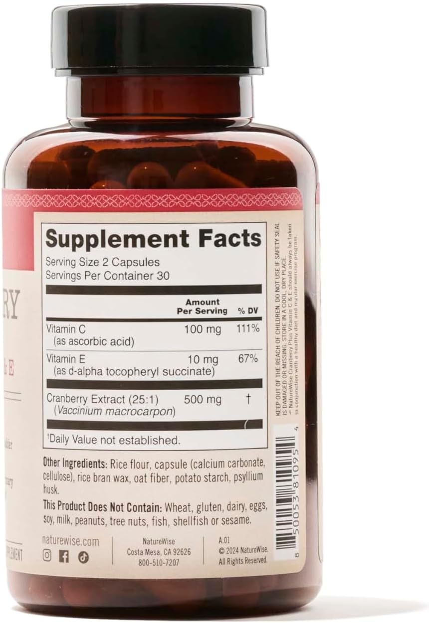 Cranberry supplements are a popular dietary supplement for maintaining urinary tract and bladder health. Cranberries contain compounds known as proanthocyanidins (PACs) which help cleanse the urinary tract and bladder, keeping the walls of the urinary tract clean and healthy. NatureWise Cranberry Capsules deliver a potent dose of cranberry extract in a clean veggie capsule. Every serving of two capsules contains 500 mg of cranberry extract that has a concentration of 25:1 which is approximately 12,500 mg of cranberries. This cranberry supplement is made for both men and women who want to support their urinary tract health daily.* Our high concentration ensures that users can enjoy the maximum benefits of cranberries without the need to consume large quantities of the fruit or juice, which are packed with sugar. We also added Vitamin C and Vitamin E to these cranberry capsules for extra health benefits. Vitamin C, also known as ascorbic acid, is a powerful antioxidant that supports the immune system.* By supporting immune function, Vitamin C helps maintain overall health, which is particularly important for urinary tract health. Vitamin E is another potent antioxidant included in this supplement. Vitamin E is essential for maintaining healthy skin and eyes, and it also supports immune health.* By including both Vitamin C and Vitamin E, these cranberry capsules provide comprehensive support for the immune system, enhancing the body’s ability to maintain a healthy urinary tract and bladder. NatureWise Cranberry Capsules are completely vegan, making them suitable for those who avoid animal products. Additionally, they are sugar-free, which is beneficial for those monitoring their sugar intake. The capsules are also non-GMO and free from a variety of common allergens, including wheat, gluten, eggs, soy, dairy, milk, tree nuts, peanuts, fish, shellfish, and sesame. *Statements regarding dietary supplements have not been evaluated by the FDA and are not intended to diagnose, treat, cure, or prevent any disease or health condition