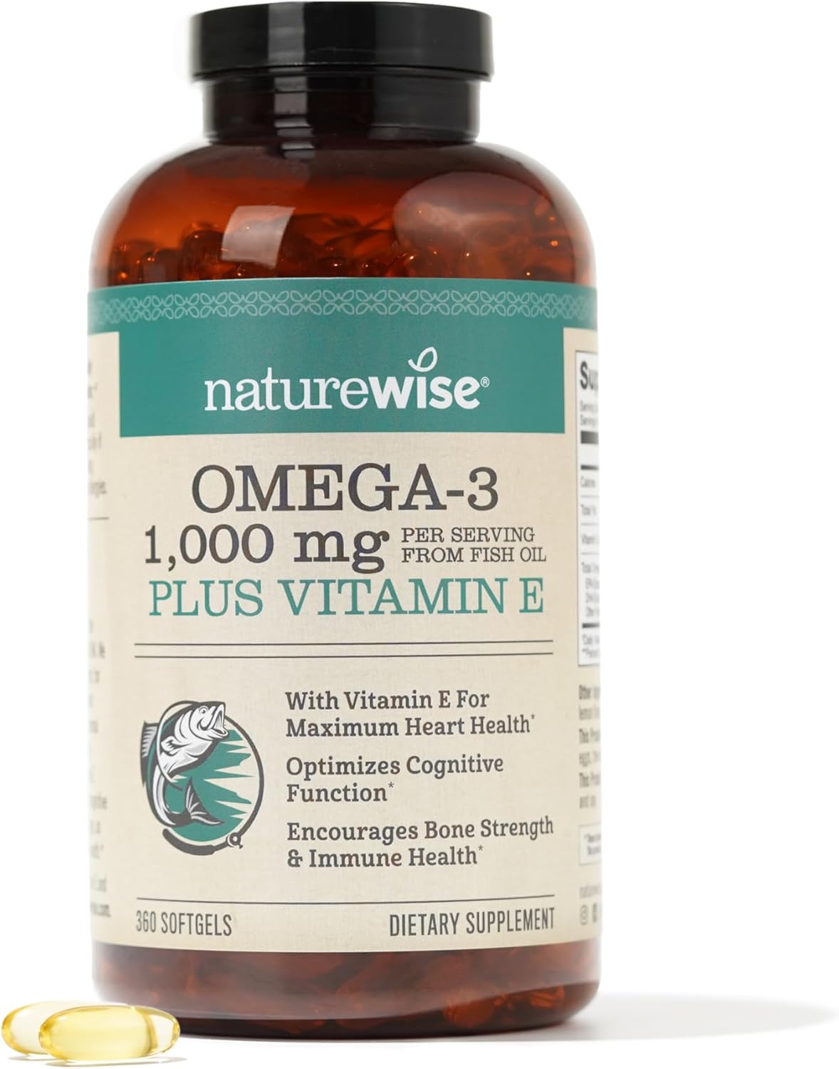 Say goodbye to stinky fish oil supplements and say hello to NatureWise Omega 3 + Vitamin E softgels. Every serving of this omega 3 supplement provides 1060 mg of Omega 3 fatty acids with the added benefits of vitamin E. Why take omega 3 fish oil with vitamin E? Because this dynamic duo works together to support your overall heart health, as well as your eye health. Vitamin E is a fat-soluble vitamin with antioxidant properties that supports omega-3 fatty acids in the body. Omega 3 fatty acids also support overall joint health, comfort, and flexibility. NatureWise Omega 3 + Vitamin E uses a high-quality blend of fish oils to deliver the best source of omega-3 fatty acids. Our Omega 3 supplement is made with premium omega 3 fish oils with the optimal dose of 600 mg EPA and 400 mg DHA fatty acids, and 60 mg of other fatty acids, so your body gets support for your overall heart, brain, joint, and eye health.* NatureWise Omega 3 softgels are gluten-free and non-GMO. These softgels do not contain wheat, gluten, eggs, dairy, peanuts, tree nuts, and corn. This product contains fish (anchovy, mackerel, sardine) and soy. *Statements regarding dietary supplements have not been evaluated by the FDA and are not intended to diagnose, treat, cure, or prevent any disease or health condition