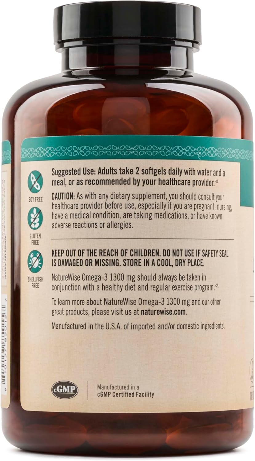 Naturewise High Potency Omega 3 1300 Mg As Tg From Wild Ocean-Caught Fish Oil For Ultra Absorption - Brain & Heart Health - Burpless, Gluten, Dairy, & Soy Free, Non-Gmo - 180 Softgels[3-Month Supply]