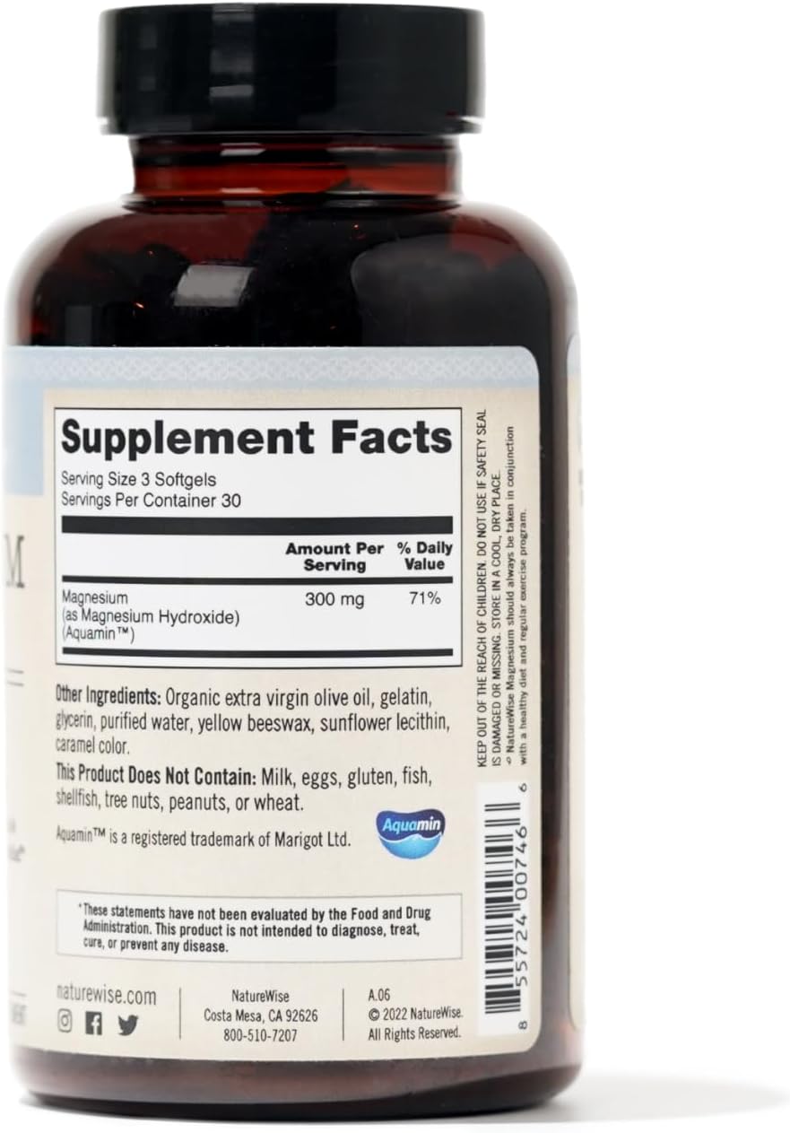Magnesium Supplement for Women & Men Many adults may not receive adequate magnesium intake through food alone. Choosing the most natural magnesium supplements is an integral part of maintaining overall health.* NatureWise uses premium magnesium in a softgel capsule, making effective magnesium supplementation a natural part of your day — no chalky drinks or powders required. Essential Mineral for Health & Mood Magnesium deficiency may result in nausea, low energy or mood, and muscle cramps. Every serving of NatureWise magnesium provides 300mg (70% of recommended daily value) to support healthy blood pressure levels, bone density, improved mood, and sustained energy for all the important activities in your day.* Made in the United States with Premium Ingredients At NatureWise, we use only the highest quality ingredients for your peace of mind and wellbeing. Our magnesium supplement utilizes non-GMO Aquamin magnesium, sourced directly from ocean water and is free of milk, eggs, fish, shellfish, tree nuts, peanuts, and wheat. NatureWise magnesium is Manufactured in the USA in our cGMP (Good Manufacturing Practices) certified facility that is audited for quality control by independent organizations, including NPA, NSF, and UL. *These statements have not been evaluated by the FDA. This product is not intended to diagnose, treat, cure, or prevent any disease