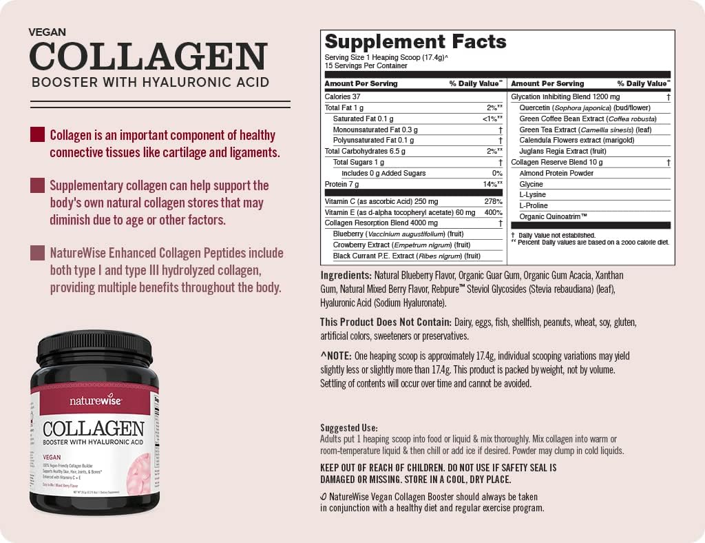 Promotes Youthful Skin: Natural collagen production decreases with age, increasing the likelihood of wrinkle formation and dry skin. Several studies support that higher production levels of collagen can encourage skin hydration and elasticityEncourages Nail and Hair Vitality: With an abundance of amino acids, our Vegan Collagen Booster provides the body with organic compounds to promote the normal production of hair proteins and strong nail infrastructure for damage-resistant hair and nailsSupprts Ongoing Bone Strength: About 90% of a bone’s matrix is composed of collagen, which provides bones’ structure and strength. Maintaining high collagen levels may help support the maintenance of normal bone density levelsSupports Normal Joint Function: Cartilage cushions joints, reducing friction and enabling fluid movement. As a critical component of cartilage, collagen aids in promoting joint integrity and mobility. Our Vegan Collagen Booster supports normal, natural collagen production to encourage ongoing joint healthNatural Ingredients: Mixed Berry Vegan Collagen Booster is plant-based, gluten-free, and made without artificial fillers, colors, sweeteners, and preservatives. Each batch is manufactured in a cGMP-certified facility with third-party control auditsNothing Fishy About It: Plant-Based Collagen Boost for a Natural Glow Collagen is the most abundant protein in the human body. Found in connective tissues, collagen is one of the core building blocks of tendons, cartilage, ligaments, bones, and skin, playing a vital role in providing strength, structure, and elasticity. While collagen is formed naturally by the body, production levels decline in response to various factors, such as age, lifestyle, or environment. Encouraging the ongoing normal production of collagen can help promote the retention and continued synthesis of collagen.* Maintaining high collagen levels supports the continued strength, function, and health of joints, bones, skin, hair, and nails.* Crafted without any animal-derived ingredients for a 100% vegan product, NatureWise Mixed Berry Vegan Collagen Booster contains glycine and proline, two of the amino acid components of collagen. Each scoop provides support for natural collagen production, to promote a glowing appearance and internal wellness!* Natural, Plant-Based Collagen NatureWise’s Mixed Berry Vegan Collagen Booster contains natural herbal ingredients with collagen-promoting compounds, including select amino acids and proteins sourced from almonds.* This product is non-GMO, gluten-free, and plant-based, containing no wheat, dairy, corn, soy, eggs, tree nuts, peanuts, or fish or animal byproducts. Each serving is enhanced by 250 mg of vitamin C and 60 mg of vitamin E. Manufactured in the USA NatureWise is proud to make our Mixed Berry Vegan Collagen Booster with premium ingredients of the highest quality. Our products are made in a cGMP-certified facility and third-party tested to guarantee that only the best product arrives on our customers’ doorsteps. *These statements have not been evaluated by the FDA. This product is not intended to diagnose, treat, cure, or prevent any disease