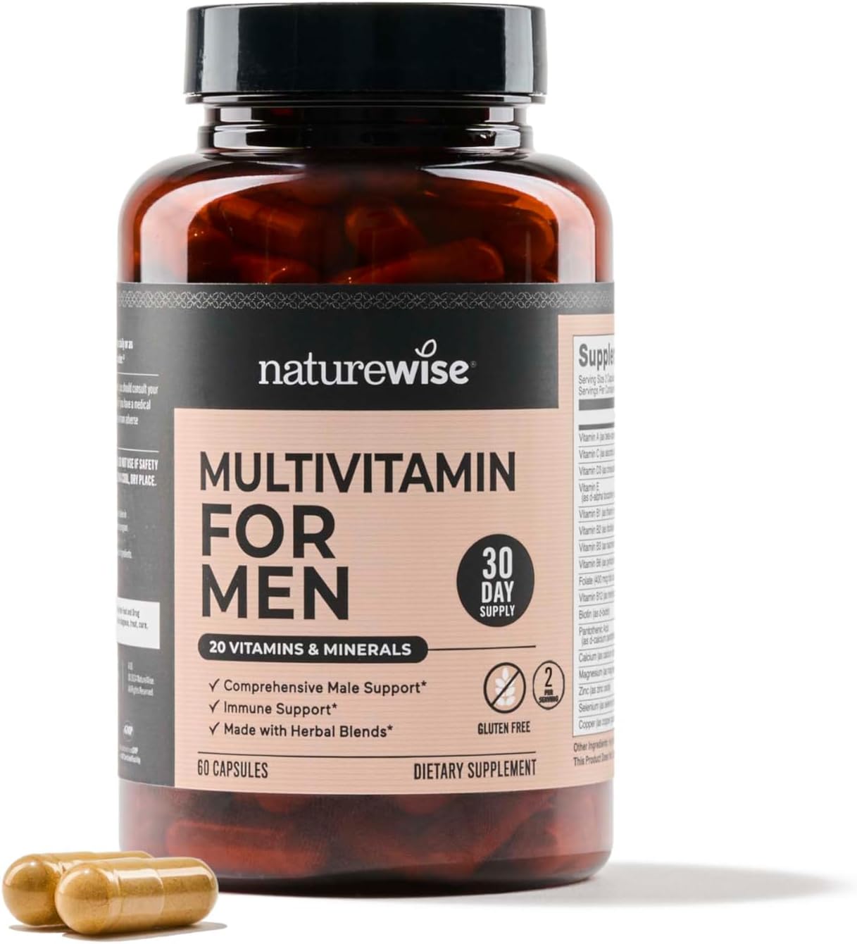 Naturewise Multivitamin For Men Provides Comprehensive Support For Men'S Health. This Unique Formula Addresses Key Aspects Of Men'S Health With 20 Vitamins And Minerals To Support Heart And Immune Health.* This Multivitamin Contains Vitamin A, Vitamin C, Vitamin D3, Vitamin E, B-Complex, Calcium, Magnesium, Zinc, Selenium, Copper, Manganese, Chromium, And Molybdenum. On Top Of The Daily Essential Nutrients, We Also Added Three Herbal Blends Aimed Toward Men'S Vitality, Energy, Performance, And Prostate Health.* The Botanical Male Support Blend Contains Nettle Leaf, Saw Palmetto, And Ginkgo Biloba Extract. These Herbal Ingredients Are Known For Supporting Overall Prostate Health And Urinary Tract Health.* Our Antioxidant Blend Contains Herbal Ingredients That Are Rich In Beneficial Polyphenols: Green Tea Extract, Elderberry, Acai Berry, Panax Ginseng Extract, Guarana, Rhodiola Rosea, And Pomegranate Extract. Lastly, We Added A Boost Of Immune Support With A Blend Of Turmeric Extract, Ginger, Garlic, And Echinacea Extract.* Just Take 2 Capsules A Day To Support Your Immune Health, Prostate Health, And Overall Wellbeing. * This Multivitamin Is Soy-Free, Magnesium Stearate-Free, Gluten-Free, Non-Gmo, And Does Not Contain Wheat, Dairy, Eggs, Soy, Peanuts, Tree Nuts, Fish, Shellfish. *Statements Regarding Dietary Supplements Have Not Been Evaluated By The Fda And Are Not Intended To Diagnose, Treat, Cure, Or Prevent Any Disease Or Health Condition