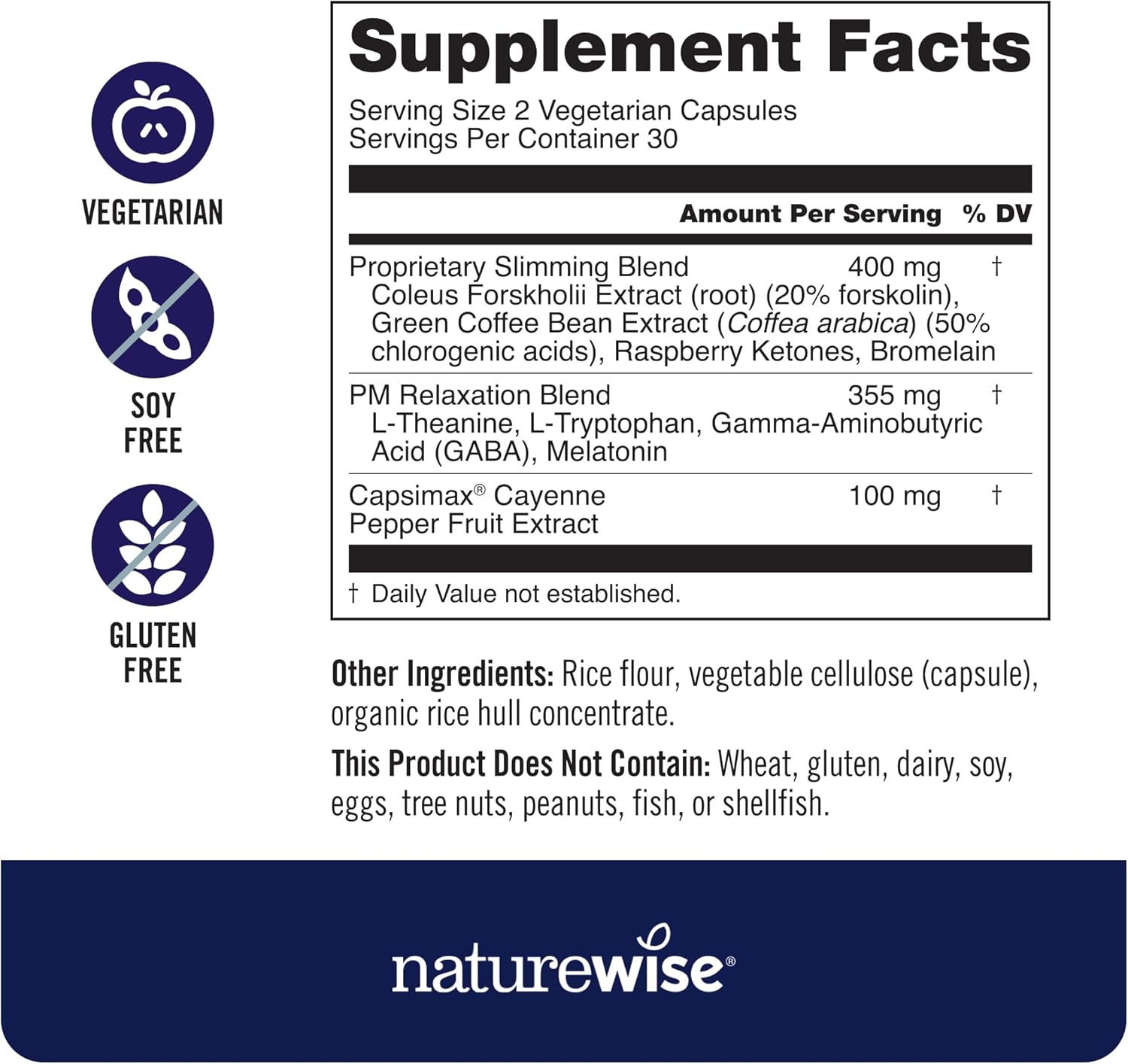 Vegetarian, Non-Gmo: Naturewise Nighttime Slim Is Vegetarian, Gluten-Free, Non-Gmo, And Does Not Contain Wheat, Eggs, Dairy, Soy, Tree Nuts, Peanuts, Fish, Or Shellfish