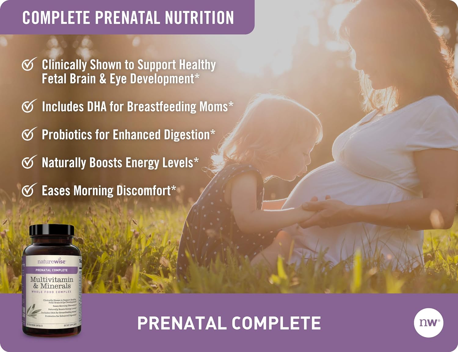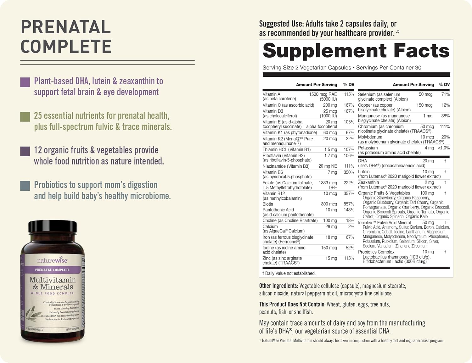 DESCRIPTION : NatureWise Prenatal Whole Food Multivitamin for Women | Folate, Vegetarian DHA, Non-Constipating Iron, Plant-Based Calcium, Lutemax Lutein, Probiotics, Vitamin D3, Gluten Free | 60 count