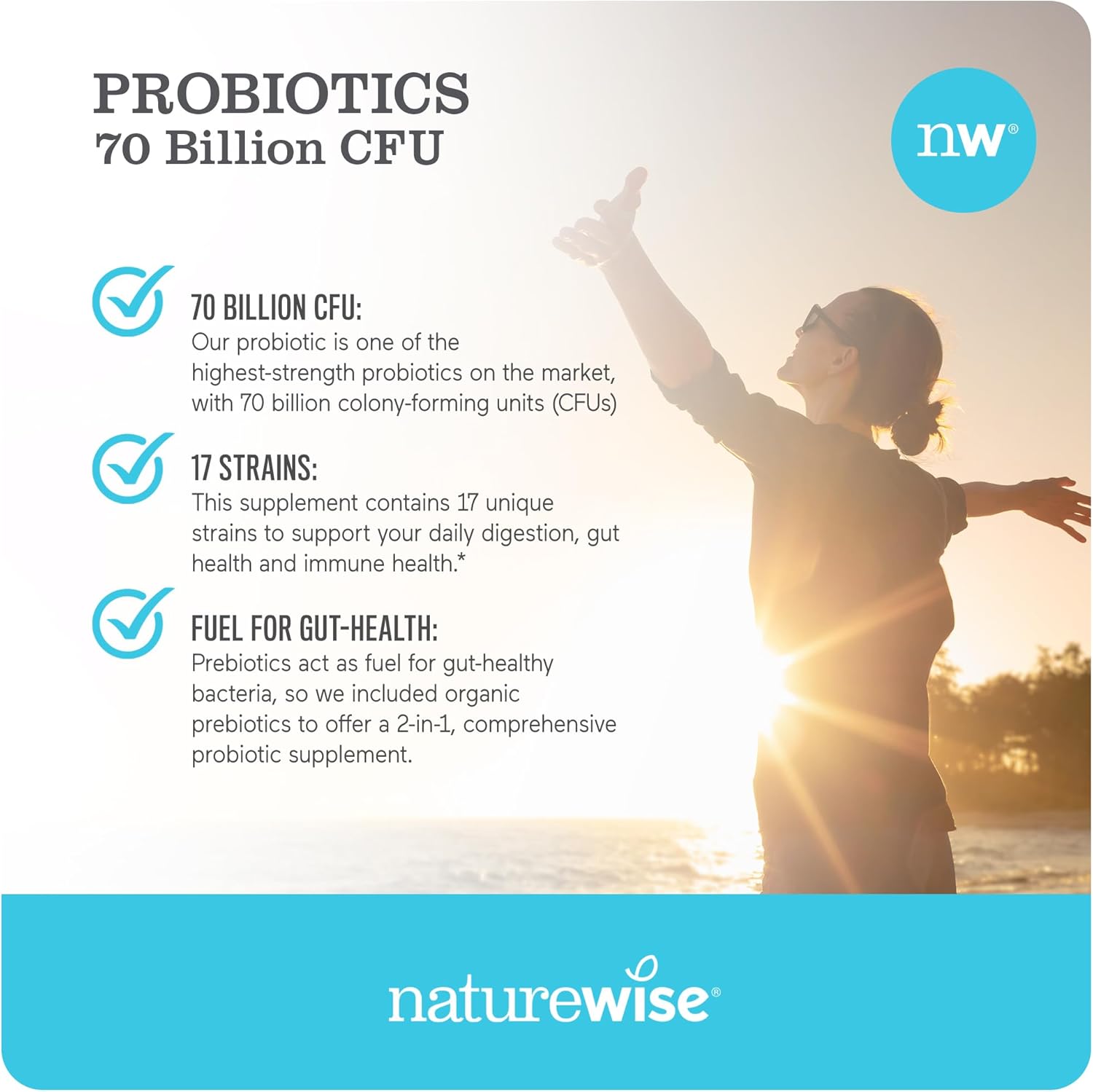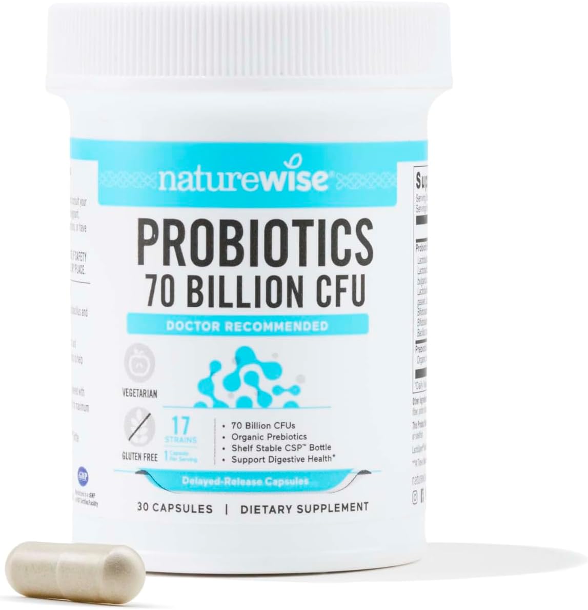 Naturewise Probiotics 70 Billion Cfu - 17 Strains + Organic Prebiotics - Immune, Digestive & Gut Health Probiotics For Women & Men - Vegetarian, Gluten-Free, Non-Gmo - 30 Capsules[1-Month Supply]