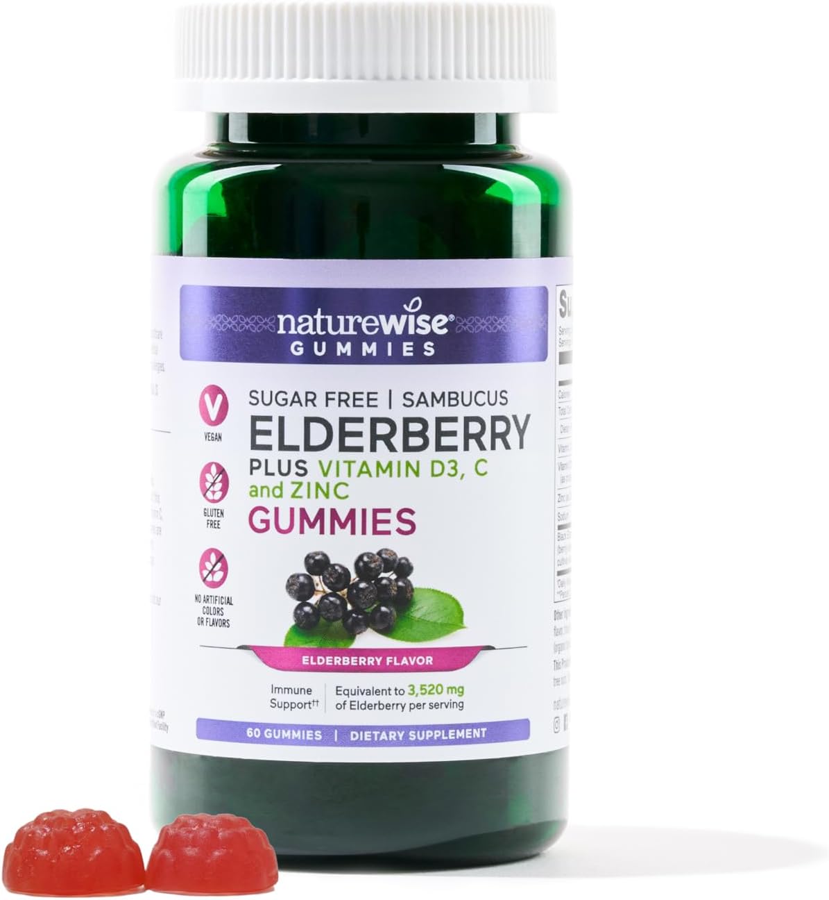 Naturewise Sambucus Elderberry Gummies - Sugar-Free - Daily Immune Support Supplement For Kids And Adults*, With Vitamin C, Vitamin D3, Zinc - Vegan, Gluten Free, Non-Gmo - 60 Gummies[1-Month Supply]