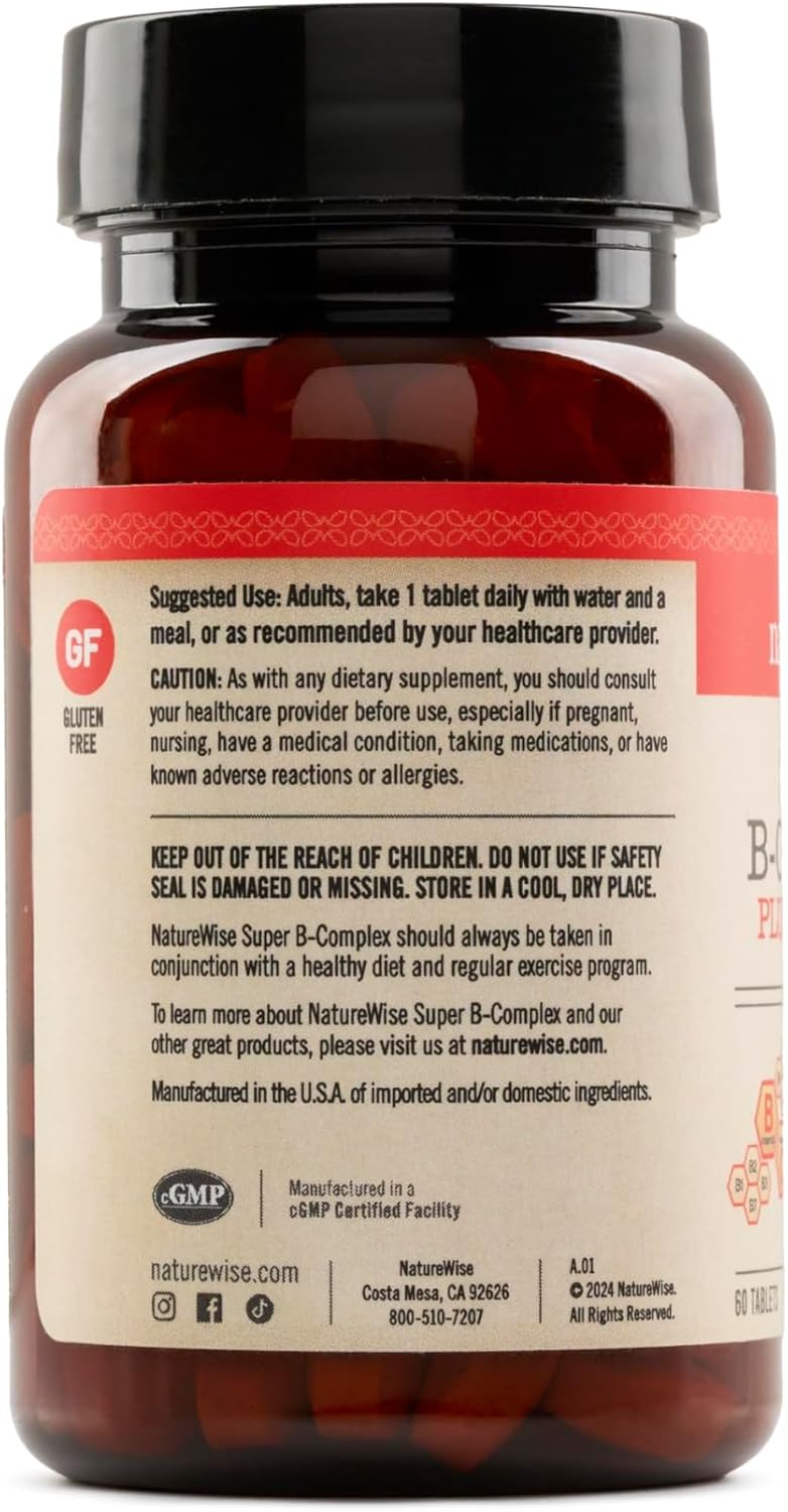 Naturewise Super Vitamin B Complex For Women And Men - With Vitamin C, Folic Acid Biotin B1 B2 B3 B6 B12 - Support Cellular Energy & Mental Clarity - Vegan, Gluten & Dairy Free, Non-Gmo - 60 Tablets