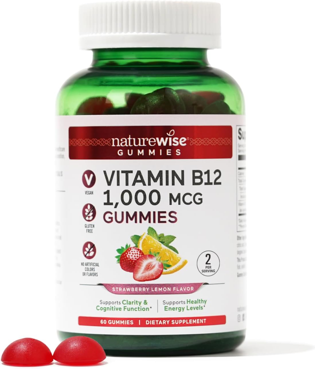 Naturewise Vitamin B12 Gummies For Adults, 1000 Mcg - Strawberry Lemon Flavor - Supports Daily Energy, Mental Clarity, Cognitive Function - Vegan, Gluten-Free, Non-Gmo - 60 Gummies[1-Month Supply]