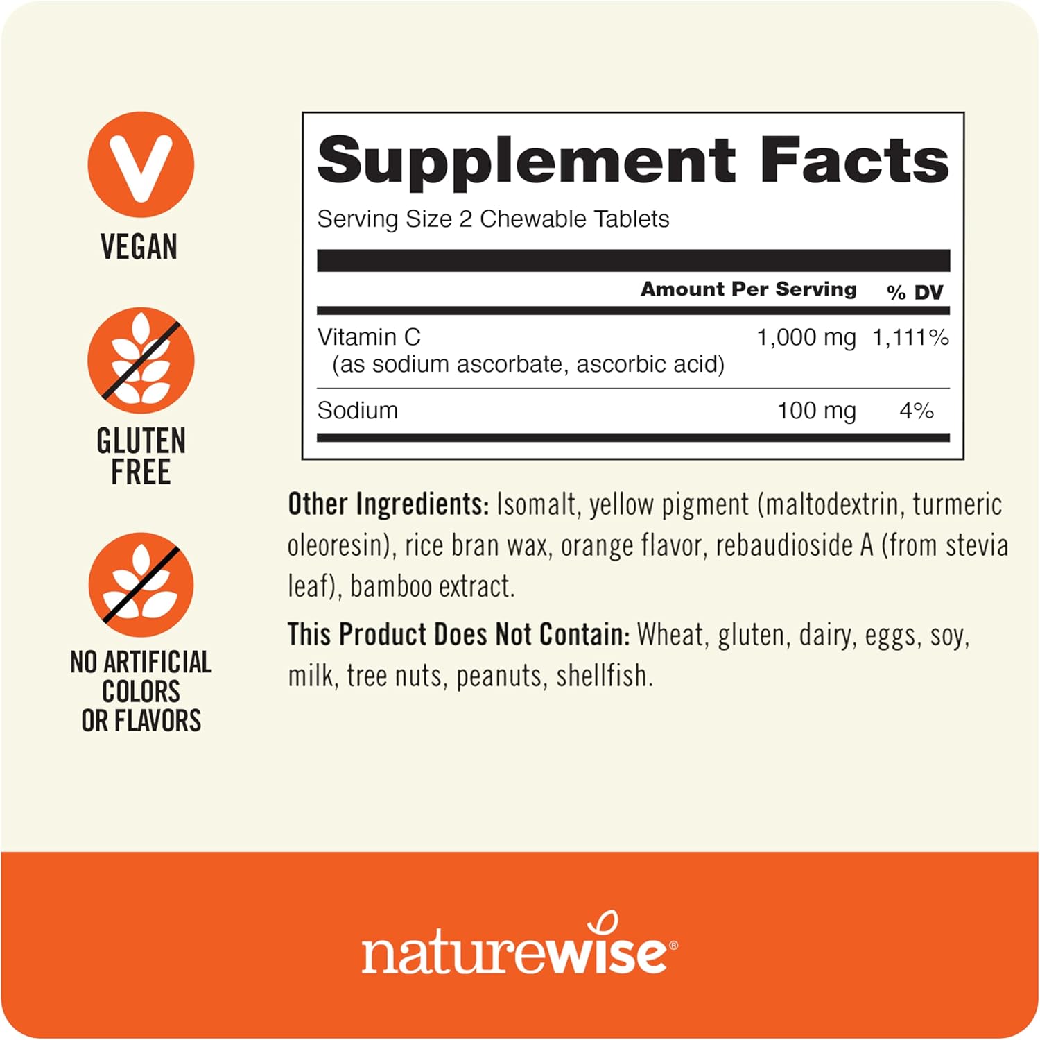 Vegan & Non-Gmo: Naturewise Vitamin C 1000 Mg Chewables Are Vegan, Non-Gmo, And Gluten Free. These Premium Chewable Tablets Do Not Contain Wheat, Gluten, Dairy, Eggs, Soy, Milk, Tree Nuts, Peanuts, Shellfish, Artificial Colors Or Flavors