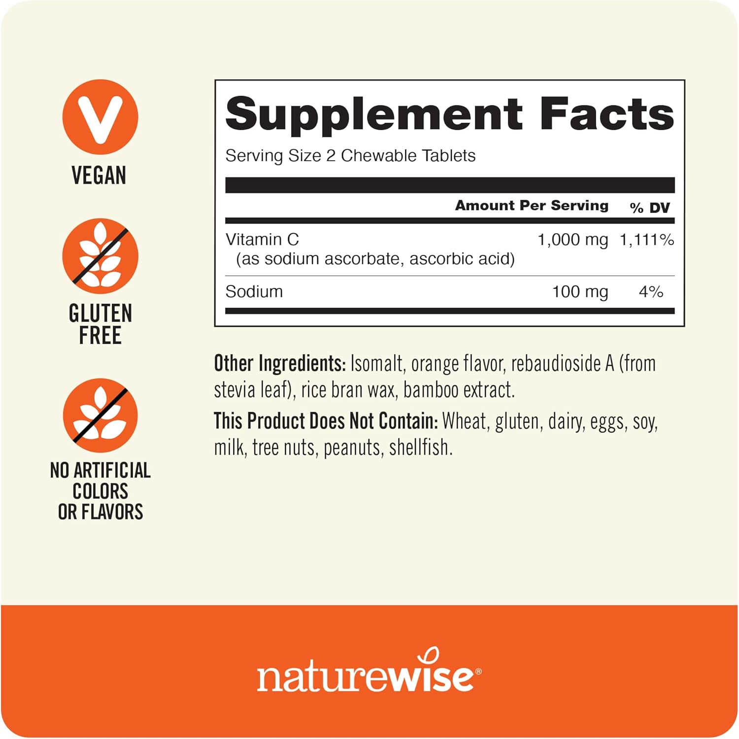 Vegan & Non-Gmo: Naturewise Vitamin C 1000 Mg Chewables Are Vegan, Non-Gmo, And Gluten Free. These Premium Chewable Tablets Do Not Contain Wheat, Gluten, Dairy, Eggs, Soy, Milk, Tree Nuts, Peanuts, Shellfish, Artificial Colors Or Flavors