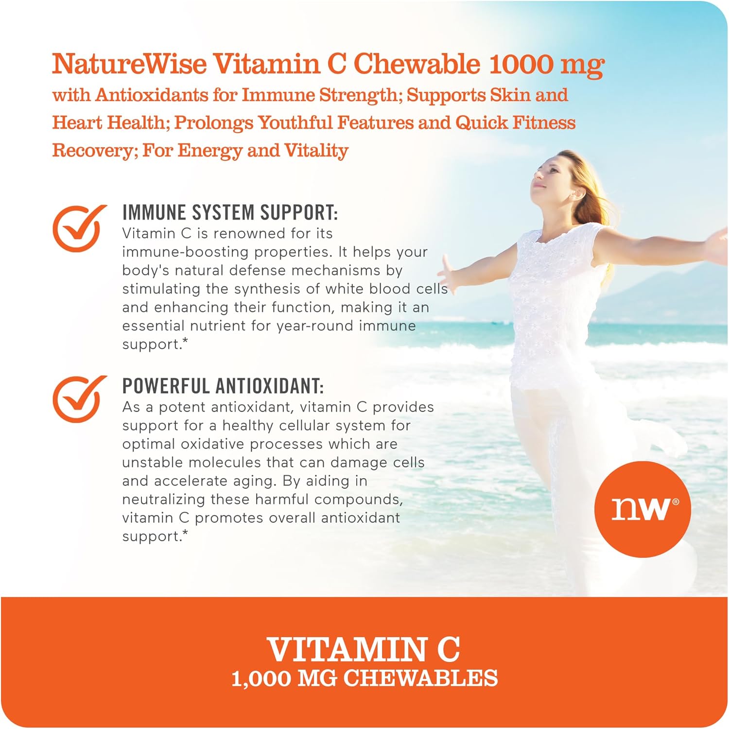 Make Your Day Brighter By Incorporating Naturewise Vitamin C Chewables - 1,000 Mg Into Your Routine. These Tangy, Orange-Flavored Chewable Vitamin C Tablets Offer Delicious Support For Your Immune System On The Go.* Whether You Want To Take It During Your Morning Routine Or In The Middle Of The Day, Naturewise Vitamin C Chewables Are An Easy Way To Get In That Extra Dose Of Vitamin C. Vitamin C Is An Important Nutrient That Supports Your Daily Health In Many Ways: Vitamin C Supports Your Overall Immunity And Collagen Synthesis.* Two Of These Chewable Vitamin C Tablets Contain A Potent Dose Of 1,000 Mg Of Vitamin C Or 1,111% Of Your Daily Intake. Experience The Benefits Of Taking Vitamin C In The Form Of This Delicious Chewable Tablet, Making It Easier To Add This Important Vitamin To Your Everyday Rotation. Made With No Artificial Colors Or Flavors, Naturewise Vitamin C Chewables Are Formulated With Quality Ingredients That Still Taste Delicious. Say Goodbye To Those Hard-To-Swallow Vitamin C Pills And Say Hello To A Citrusy Chewable Vitamin C. Naturewise Vitamin C Chewables - 1,000 Mg Are Vegan, Gluten-Free, And Third-Party Tested For Purity And Potency. This Chewable Vitamin C Does Not Contain Wheat, Gluten, Dairy, Eggs, Soy, Milk, Tree Nuts, Peanuts, And Shellfish. Caution: As With Any Dietary Supplement, You Should Consult Your Healthcare Provider Before Use, Especially If You Are Pregnant, Nursing, Have A Medical Condition, Are Taking Medications, Or Have Known Adverse Reactions Or Allergies. Keep Out Of The Reach Of Children. Do Not Use If Safety Seal Is Damaged Or Missing. Store In A Cool, Dry Place