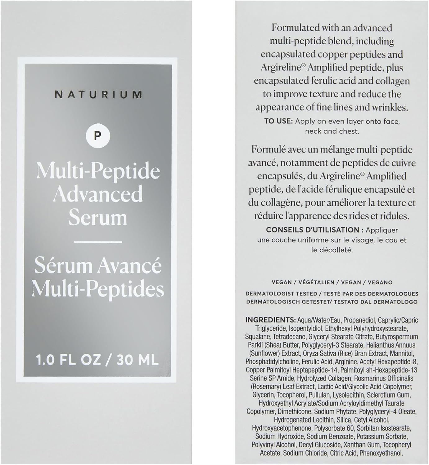 Product Description Multi-Peptide Advanced Serum Safety Warning External use only,FIRMING & HYDRATING LIFT: Our Multi-Peptide Advanced face serum helps improve texture for a smoother complexion, supports firmer-looking skin, and plumps for a lifted effect,POWERFUL, ADVANCED MULTI-PEPTIDE BLEND: The encapsulated copper peptides and Argireline Amplified peptide work to improve texture and reduce the appearance of fine lines and wrinkles. Encapsulated ferulic acid helps firm skin's appearance,MOST SKIN TYPES: Perfect for ageing, blemish-prone, combination, dry, and sensitive skin, though a patch test is advised prior to use. Can be applied daily (AM + PM). Use 1-2 pea sized drops on clean skin followed by a moisturiser (and SPF during the day),PROUDLY FORMULATED: All of our products are formulated to be pH level appropriate, Vegan, Skin Compatible, & Dermatologist Tested,SKINCARE THAT WORKS: At Naturium, we are committed to providing affordable skincare essentials using ingredients that benefit the skin to create effective formulas