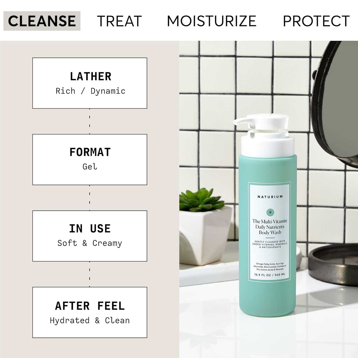 About this item EVERYDAY WASH: Our daily multi-vitamin body wash is formulated to remove dirt, oil and other impurities, while hydrating and replenishing essential nutrients MULTI-USE CLEANSER: Developed for all skin types and appropriate for daily use. This body wash can also be used as a facial cleanser RESTORING FORMULA: Our nutrient-rich body wash is formulated to support the skinās NMF (natural moisturizing factor) balance, featuring an amino acid composition, vitamins and minerals that maintain healthier-looking skin PROUDLY FORMULATED: All of our products are formulated to be pH level appropriate, made in the USA, Vegan, Cruelty Free, Paraben Free, Gluten Free, Skin Compatible, & Dermatologist Tested. Most of our skincare is Synthetic Fragrance Free SKINCARE THAT WORKS: At Naturium, we are committed to providing affordable skincare essentials that use only ingredients directly benefiting the skinās health, which support the integrity and effectiveness of our formulations āŗ See more product details,EVERYDAY WASH: Our daily multi-vitamin body wash is formulated to remove dirt, oil and other impurities, while hydrating and replenishing essential nutrients,MULTI-USE CLEANSER: Developed for all skin types and appropriate for daily use. This body wash can also be used as a facial cleanser,RESTORING FORMULA: Our nutrient-rich body wash is formulated to support the skinās NMF (natural moisturizing factor) balance, featuring an amino acid composition, vitamins and minerals that maintain healthier-looking skin,PROUDLY FORMULATED: All of our products are formulated to be pH level appropriate, made in the USA, Vegan, Cruelty Free, Paraben Free, Gluten Free, Skin Compatible, & Dermatologist Tested. Most of our skincare is Synthetic Fragrance Free,SKINCARE THAT WORKS: At Naturium, we are committed to providing affordable skincare essentials that use only ingredients directly benefiting the skinās health, which support the integrity and effectiveness of our formulations