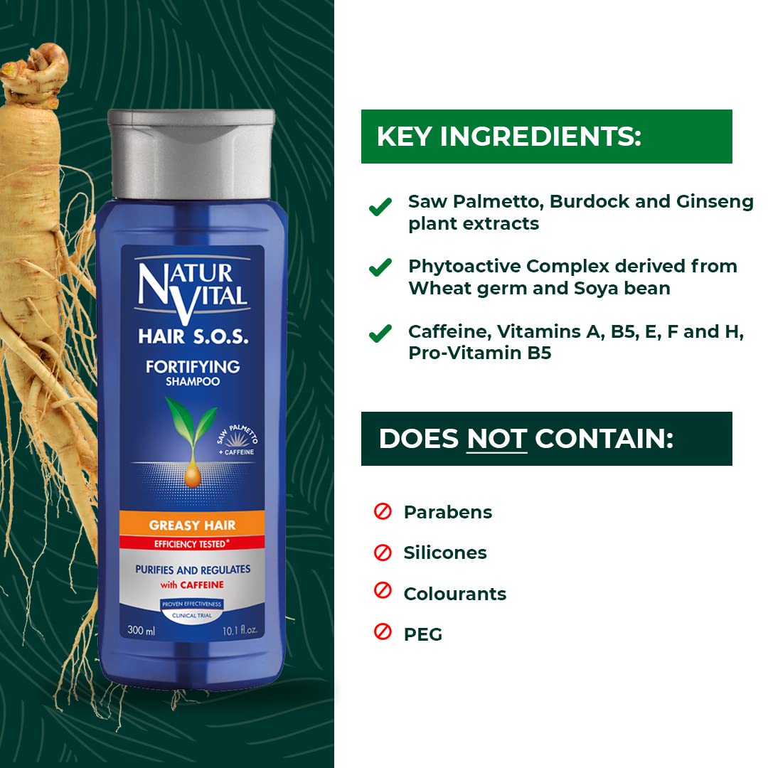 SPECIALLY FORMULATED TO HELP WITH GREASY HAIR: NaturVital plant-based active ingredients in our popular anti-grease shampoo help to combat acute build-up and oil. It contains a high proportion of natural ingredients, such as Saw Palmetto, Burdock and Ginseng extracts and Phytoactive Complex (derived from Wheat germ and Soya beans). These provide the hair bulb with energy and nutrients to boost the hair's fullness
