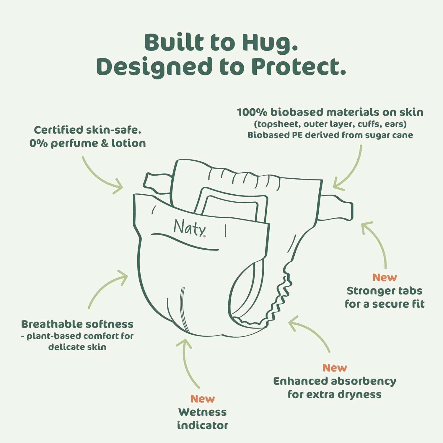 About this item 100% BIOBASED ON SKIN: The only baby diaper certified 100% biobased in contact with skin (liner, cuffs, ears, outer layer). No fossil-based plastic touches baby’s skin. Certified by DinCertco for plant-based purity. CERTIFIED SKIN-SAFE: Dermatologically tested with “Excellent” results on sensitive skin (Dermatest). Oeko-Tex Standard 100 certified and verified against 1,000+ substances incl. chlorine, PFAS, parabens, phthalates, and dyes. Free from fragrance, lotion, and latex. PLANT-BASED COMFORT & SOFTNESS: Super soft, made with breathable, gentle materials. Designed for delicate baby skin. FSC-certified, vegan, and responsibly made. NEXT-GEN DIAPER PERFORMANCE: Stronger tabs, wetness indicator, and up to 20% better absorbency vs our original range. Designed for reliable dryness day and night, and with new Scandinavian design. TRUSTED SWEDISH CARE: Developed in Sweden since 1994, with certifications and rigorous testing across diapers, wipes, and feminine care. From Naty — previously Eco by Naty.  See more product details,100% BIOBASED ON SKIN: The only baby diaper certified 100% biobased in contact with skin (liner, cuffs, ears, outer layer). No fossil-based plastic touches baby’s skin. Certified by DinCertco for plant-based purity,CERTIFIED SKIN-SAFE: Dermatologically tested with “Excellent” results on sensitive skin (Dermatest). Oeko-Tex Standard 100 certified and verified against 1,000+ substances incl. chlorine, PFAS, parabens, phthalates, and dyes. Free from fragrance, lotion, and latex,PLANT-BASED COMFORT & SOFTNESS: Super soft, made with breathable, gentle materials. Designed for delicate baby skin. FSC-certified, vegan, and responsibly made,NEXT-GEN DIAPER PERFORMANCE: Stronger tabs, wetness indicator, and up to 20% better absorbency vs our original range. Designed for reliable dryness day and night, and with new Scandinavian design,TRUSTED SWEDISH CARE: Developed in Sweden since 1994, with certifications and rigorous testing across diapers, wipes, and feminine care. From Naty — previously Eco by Naty