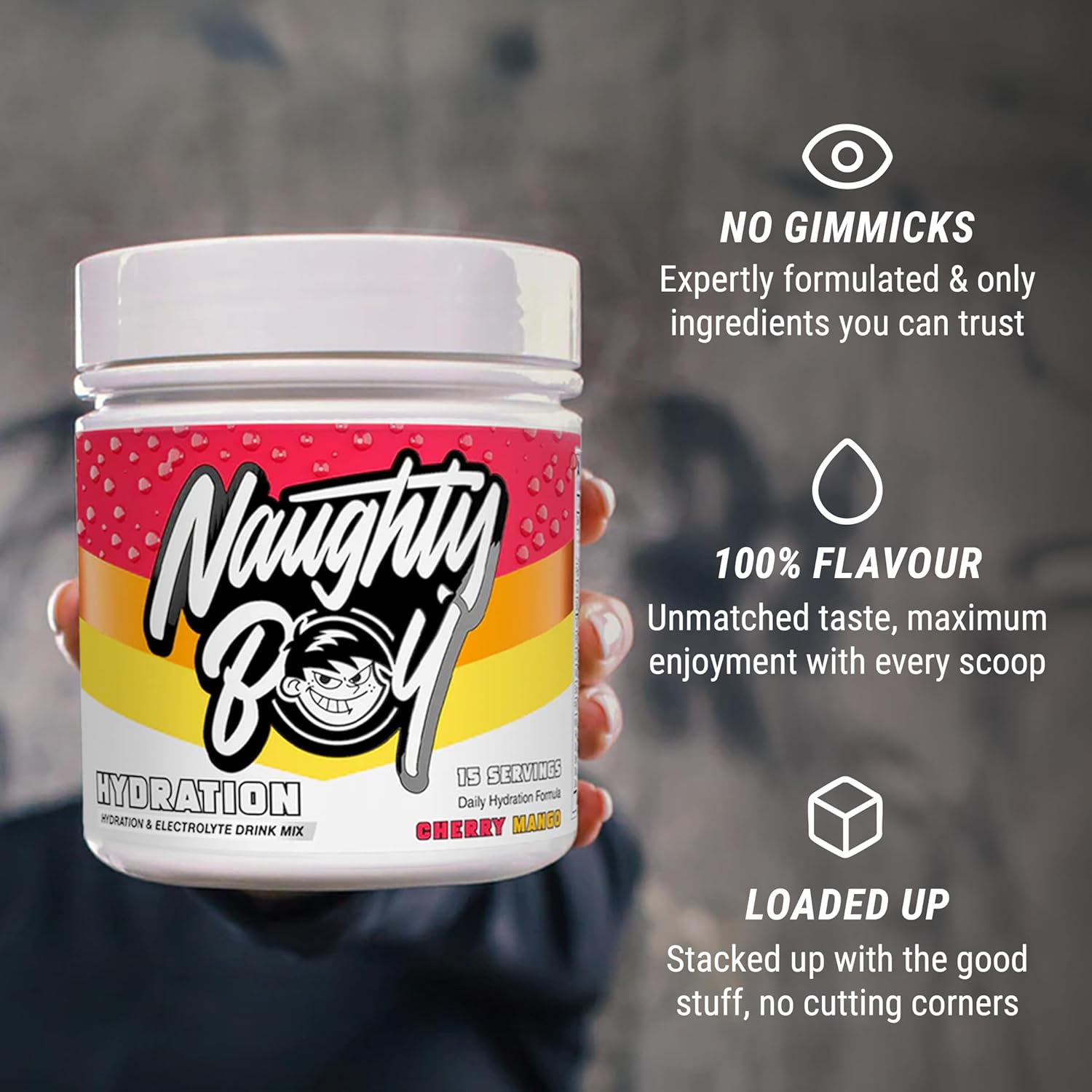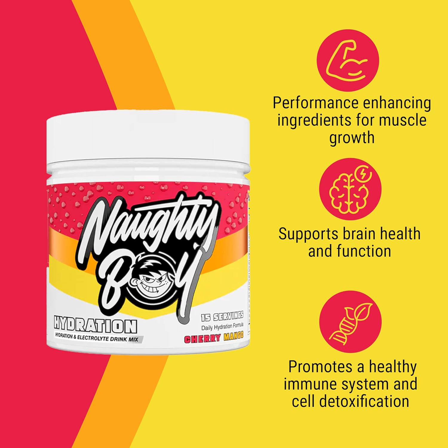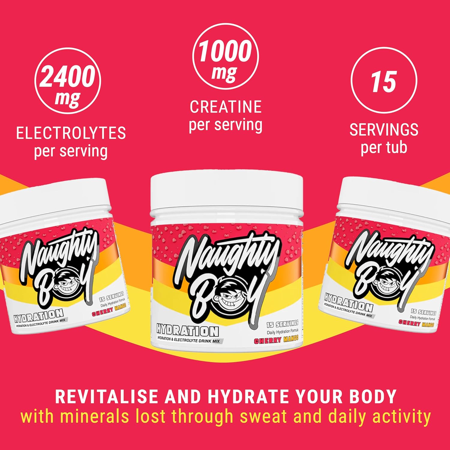 Naughty Boy Hydration & Electrolyte Drink Mix With Over 2400Mg Of Electrolytes Per Serving, Creatine & Taurine To Aid Cell Volumization And Added Super Reds- 127.5G/15 Servings (Cherry Mango)
