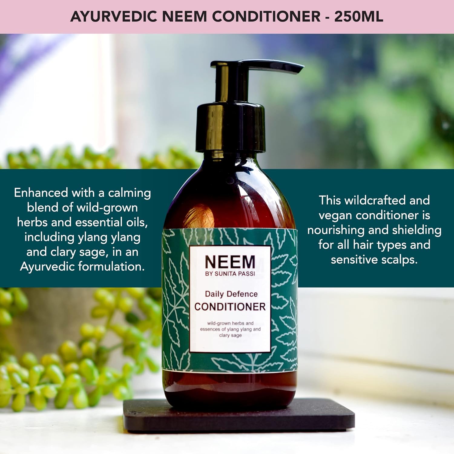 About The Product : MOISTURISE & PROTECT YOUR HAIR WITH DAILY DEFENCE NEEM CONDITIONER - Infused with natural neem protein, it moisturizes and protects from environmental stress, leaving your hair healthy and full of vitality. Enhanced with a calming blend of wild-grown herbs and essential oils, including ylang ylang and clary sage, in an Ayurvedic formulation. This wildcrafted and vegan conditioner is nourishing and shielding for all hair types and sensitive scalps. Get beautiful, protected hair every day