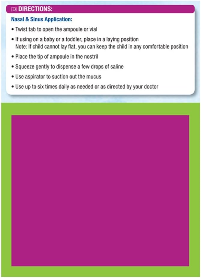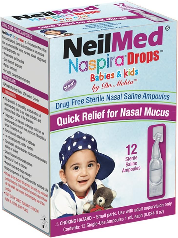 Preservative and Drug FreeEasy twist-off ampoulesUse For Nasal Allergies and Dryness, Nasal Congestion, Nasal Symptoms from Flu and Cold12 Single-Use Ampoules 1 mL each is converted from 0.033814 fl oz to 0.034Perfect for travelNaspira Drops is a drug-free, preservative-free, sterile nasal saline solution that soothes and moisturizes infants' dry or congested noses. The 1 mL (0. 033814 fl oz) ampoules are convenient for home, nursery, school, playground, travel and hospital use. A few drops of saline will moisturize, while squeezing a larger quantity will deliver a gentle nasal rinse