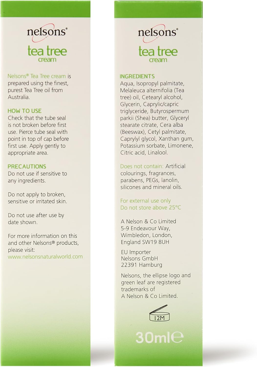 FINEST PUREST AUSTRALIAN TEA TREE: Our Tea Tree cream contains tea tree oil from Australia. Beneficial for soothing insect bites, can be applied to bumps & minor skin complaints including athlete’s foot ANTISEPTIC & ANTIFUNGAL PROPERTIES: Tea Tree oil is widely considered a natural antiseptic and antifungal, and has many traditional uses. Great to take on your travels & keep on hand at home NATURAL TEA TREE CREAM: Free from parabens, PEGs, artificial coloring, fragrances, lanolin, silicones and mineral oils. Our products provide gentle yet effective support for your needs USE ON FACE & BODY: Nelsons Tea Tree cream can be applied to your body and also your face, providing soothing benefits to your skin. Gently apply to your skin where required TRUSTED SINCE 1860: Nelsons has a rich 160 year heritage and is the largest UK manufacturer of natural healthcare products. Nelsons also have a homeopathic pharmacy situated in London Nelsons Tea Tree cream is a soothing skin cream prepared using the finest, purest tea tree oil from Australia Tea tree oil has many uses but is best known for its excellent antiseptic properties Apply gently to the appropriate area as required Suitable for the whole family For external use only,FINEST PUREST AUSTRALIAN TEA TREE: Our Tea Tree cream contains tea tree oil from Australia. Beneficial for soothing insect bites, can be applied to bumps & minor skin complaints including athlete’s foot,ANTISEPTIC & ANTIFUNGAL PROPERTIES: Tea Tree oil is widely considered a natural antiseptic and antifungal, and has many traditional uses. Great to take on your travels & keep on hand at home,NATURAL TEA TREE CREAM: Free from parabens, PEGs, artificial coloring, fragrances, lanolin, silicones and mineral oils. Our products provide gentle yet effective support for your needs,USE ON FACE & BODY: Nelsons Tea Tree cream can be applied to your body and also your face, providing soothing benefits to your skin. Gently apply to your skin where required,TRUSTED SINCE 1860: Nelsons has a rich 160 year heritage and is the largest UK manufacturer of natural healthcare products. Nelsons also have a homeopathic pharmacy situated in London,Nelsons Tea Tree cream is a soothing skin cream prepared using the finest, purest tea tree oil from Australia,Tea tree oil has many uses but is best known for its excellent antiseptic properties,Apply gently to the appropriate area as required,Suitable for the whole family,For external use only