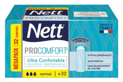 Nett Procomfort 32 Tampons Normal Are Tampons Without Applicator Designed To Offer 4-In-1 Benefits With The Revolutionary Dynamic Fit Technology ? : A Unique Silky Veil That Allows For Easy And Gentle Insertion And Removal, Stay Dry Technology That Helps The Cord Stay Dry And Clean, A Corolle® Opening That Allows A Gentle Adaptation To The Body To Collect The Flow As Close As Possible To Its Anatomy, Curved Grooves That Effectively Direct The Flow Into The Core Of The Tampon. Gynecologically Tested. Hypoallergenic (Designed To Minimize The Risk Of Allergies). All Components Have Been Rigorously Selected For Their Safety And Tolerance. Certified According To The Independent Standard 100 Oeko-Tex® Label. No Perfume. No Chlorine Bleach. Made In France