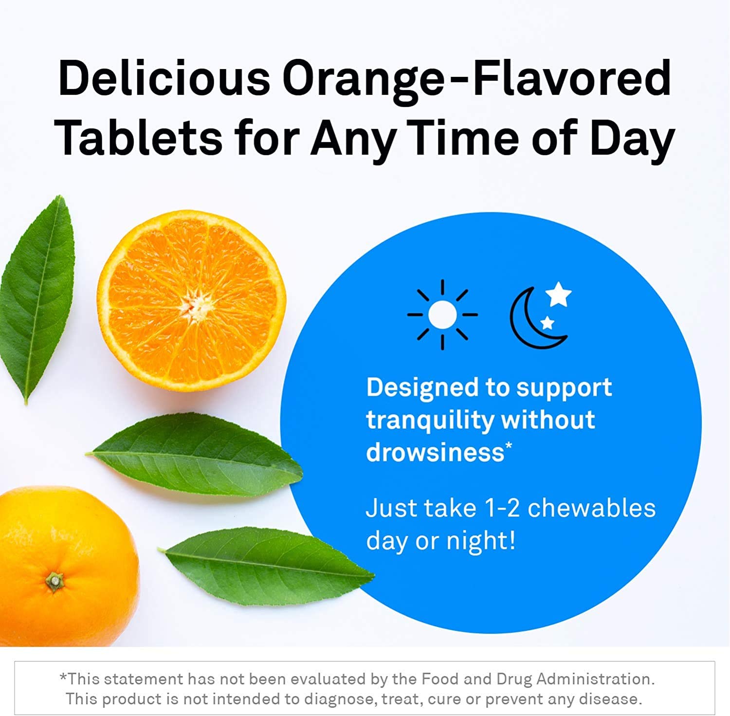 4 >Shown to Support Stress Management - Research has shown L-theanine can significantly reduce feelings of stress. Take 1-2 pleasant-tasting mood support supplement tablets day or night and ease into tranquility.* Each serving contains l-theanine 200mg and 5-HTP 60mg