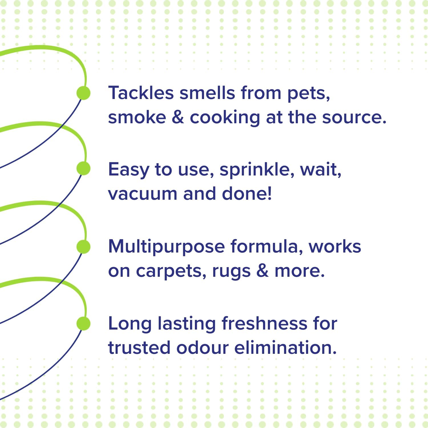 About this item Eliminates Odours at the Source: Scientifically designed to neutralise bad smells from pets, smoke, and everyday odours without simply masking them. Enjoy lasting freshness with every vacuum. Fragrance Blend of Amber & Lily Fresh: Choose between the warm, comforting notes of Amber or the floral lift of Lily Fresh. Both fragrances infuse your space after every clean. Sprinkle, Wait, Vacuum, Done!: Just sprinkle a light layer over your carpet or rug, leave for a few minutes, and vacuum as normal. Home Friendly Formula: Gentle enough for homes with kids and pets, yet powerful enough to tackle everyday household odours. Ideal for Carpets, Rugs & Pet Areas: Perfect for use in living rooms, bedrooms, hallways, and anywhere odours tend to linger. Great for refreshing pet bedding and high traffic areas. › See more product details,Eliminates Odours at the Source: Scientifically designed to neutralise bad smells from pets, smoke, and everyday odours without simply masking them. Enjoy lasting freshness with every vacuum,Fragrance Blend of Amber & Lily Fresh: Choose between the warm, comforting notes of Amber or the floral lift of Lily Fresh. Both fragrances infuse your space after every clean,Sprinkle, Wait, Vacuum, Done!: Just sprinkle a light layer over your carpet or rug, leave for a few minutes, and vacuum as normal,Home Friendly Formula: Gentle enough for homes with kids and pets, yet powerful enough to tackle everyday household odours,Ideal for Carpets, Rugs & Pet Areas: Perfect for use in living rooms, bedrooms, hallways, and anywhere odours tend to linger. Great for refreshing pet bedding and high traffic areas