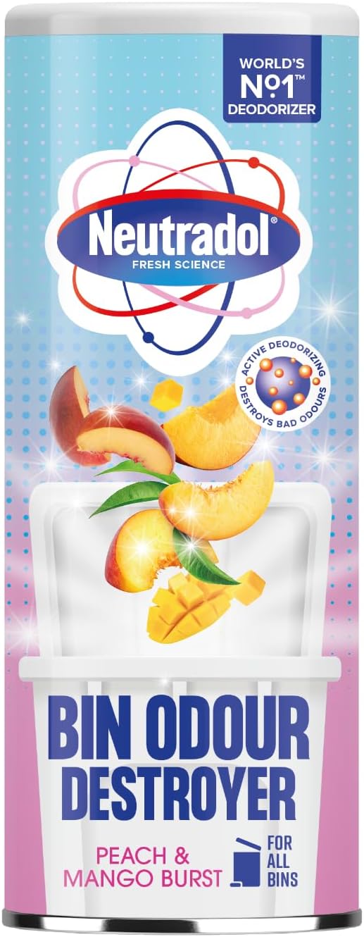 About this item Destroys Tough Bin Odours: Specially formulated to neutralise the household smells and general waste at their source without simply covering them up. Say goodbye to smelly bins, for good. Peach & Mango Scent: Infused with the clean, uplifting fragrance of Peach and Mango, this powder instantly refreshes your bin space with a tropical scent. Dry Powder Formula, No Mess, No Residue: Unlike wet sprays or gels, this fine powder leaves no sticky mess. Just sprinkle and shut the lid, leaving your bin clean, dry, and fresh. Fast-Acting & Long-Lasting: Works in seconds to neutralise odours, while its residual effect keeps your bin smelling fresh for longer, perfect for regular use between deep cleans. Perfect for Indoor & Outdoor Bins: Whether it's the kitchen bin or your outdoor wheelie bin, this effective formula is safe for use anywhere you need a burst of freshness › See more product details,Destroys Tough Bin Odours: Specially formulated to neutralise the household smells and general waste at their source without simply covering them up. Say goodbye to smelly bins, for good,Peach & Mango Scent: Infused with the clean, uplifting fragrance of Peach and Mango, this powder instantly refreshes your bin space with a tropical scent,Dry Powder Formula, No Mess, No Residue: Unlike wet sprays or gels, this fine powder leaves no sticky mess. Just sprinkle and shut the lid, leaving your bin clean, dry, and fresh,Fast-Acting & Long-Lasting: Works in seconds to neutralise odours, while its residual effect keeps your bin smelling fresh for longer, perfect for regular use between deep cleans,Perfect for Indoor & Outdoor Bins: Whether it's the kitchen bin or your outdoor wheelie bin, this effective formula is safe for use anywhere you need a burst of freshness