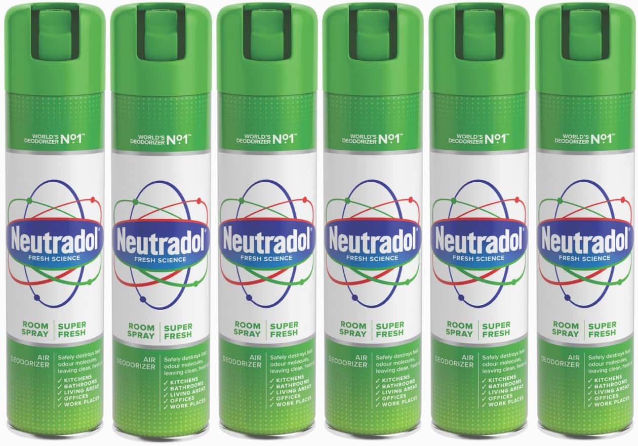 Neutradol Room Spray, Fast Acting Aerosol, Air Freshener For Home & Office, Odour Eliminator, Multipack Of 6 X 300Ml (Super Fresh)