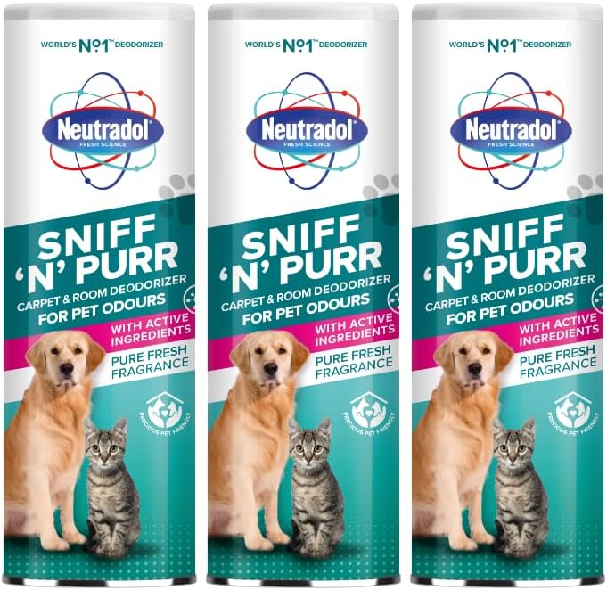 About this item Targets Stubborn Pet Odours: Effectively neutralises deep set smells caused by pets. Ideal for homes with dogs, cats, or small animals, where pet odours tend to linger in fabrics and floors. Science Powered Formula: Backed by over 30 years of innovation, Neutradol's unique formula goes beyond surface freshness, breaking down odour molecules at the source for long-lasting, truly clean results. Safe for Pets & Family: Specially formulated pet-friendly powder, Sniff n Purr is gentle enough for use in shared spaces, yet tough enough to tackle everyday odours in busy, pet loving homes. Multi-Surface Use: Perfect for pet beds, carpets, area rugs and upholstery. Refreshes any area where your pets love to lounge, sleep, or play. Fresh, Clean Finish: Leaves a subtle, clean scent without any overpowering perfume or chemical smell. No residue, no staining, just a fresher space for pets and people alike. › See more product details,Targets Stubborn Pet Odours: Effectively neutralises deep set smells caused by pets. Ideal for homes with dogs, cats, or small animals, where pet odours tend to linger in fabrics and floors,Science Powered Formula: Backed by over 30 years of innovation, Neutradol's unique formula goes beyond surface freshness, breaking down odour molecules at the source for long-lasting, truly clean results,Safe for Pets & Family: Specially formulated pet-friendly powder, Sniff n Purr is gentle enough for use in shared spaces, yet tough enough to tackle everyday odours in busy, pet loving homes,Multi-Surface Use: Perfect for pet beds, carpets, area rugs and upholstery. Refreshes any area where your pets love to lounge, sleep, or play,Fresh, Clean Finish: Leaves a subtle, clean scent without any overpowering perfume or chemical smell. No residue, no staining, just a fresher space for pets and people alike