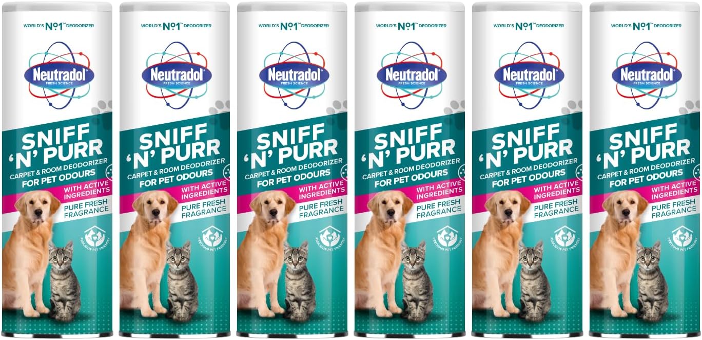 About this item Targets Stubborn Pet Odours: Effectively neutralises deep set smells caused by pets. Ideal for homes with dogs, cats, or small animals, where pet odours tend to linger in fabrics and floors. Science Powered Formula: Backed by over 30 years of innovation, Neutradol's unique formula goes beyond surface freshness, breaking down odour molecules at the source for long-lasting, truly clean results. Safe for Pets & Family: Specially formulated pet-friendly powder, Sniff n Purr is gentle enough for use in shared spaces, yet tough enough to tackle everyday odours in busy, pet loving homes. Multi-Surface Use: Perfect for pet beds, carpets, area rugs and upholstery. Refreshes any area where your pets love to lounge, sleep, or play. Fresh, Clean Finish: Leaves a subtle, clean scent without any overpowering perfume or chemical smell. No residue, no staining, just a fresher space for pets and people alike. › See more product details,Targets Stubborn Pet Odours: Effectively neutralises deep set smells caused by pets. Ideal for homes with dogs, cats, or small animals, where pet odours tend to linger in fabrics and floors,Science Powered Formula: Backed by over 30 years of innovation, Neutradol's unique formula goes beyond surface freshness, breaking down odour molecules at the source for long-lasting, truly clean results,Safe for Pets & Family: Specially formulated pet-friendly powder, Sniff n Purr is gentle enough for use in shared spaces, yet tough enough to tackle everyday odours in busy, pet loving homes,Multi-Surface Use: Perfect for pet beds, carpets, area rugs and upholstery. Refreshes any area where your pets love to lounge, sleep, or play,Fresh, Clean Finish: Leaves a subtle, clean scent without any overpowering perfume or chemical smell. No residue, no staining, just a fresher space for pets and people alike
