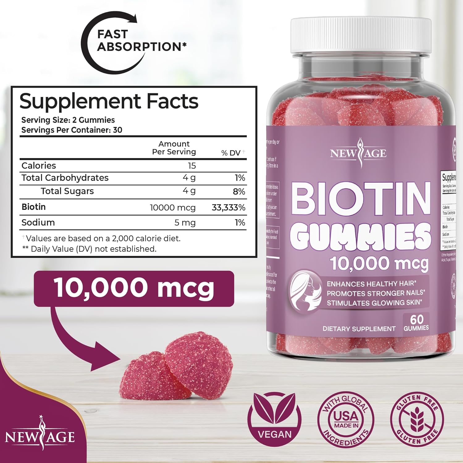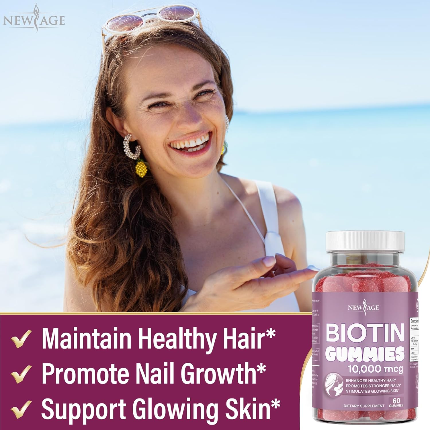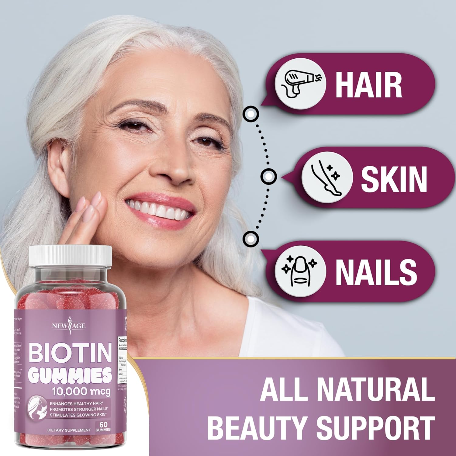 New Age Biotin Gummies Hair, Skin & Nails Gummies 10,000 Mcg - Supports Nail Strength And Healthy Hair - Non-Gmo Supplement For Women, Men - Made In Usa -120 Count