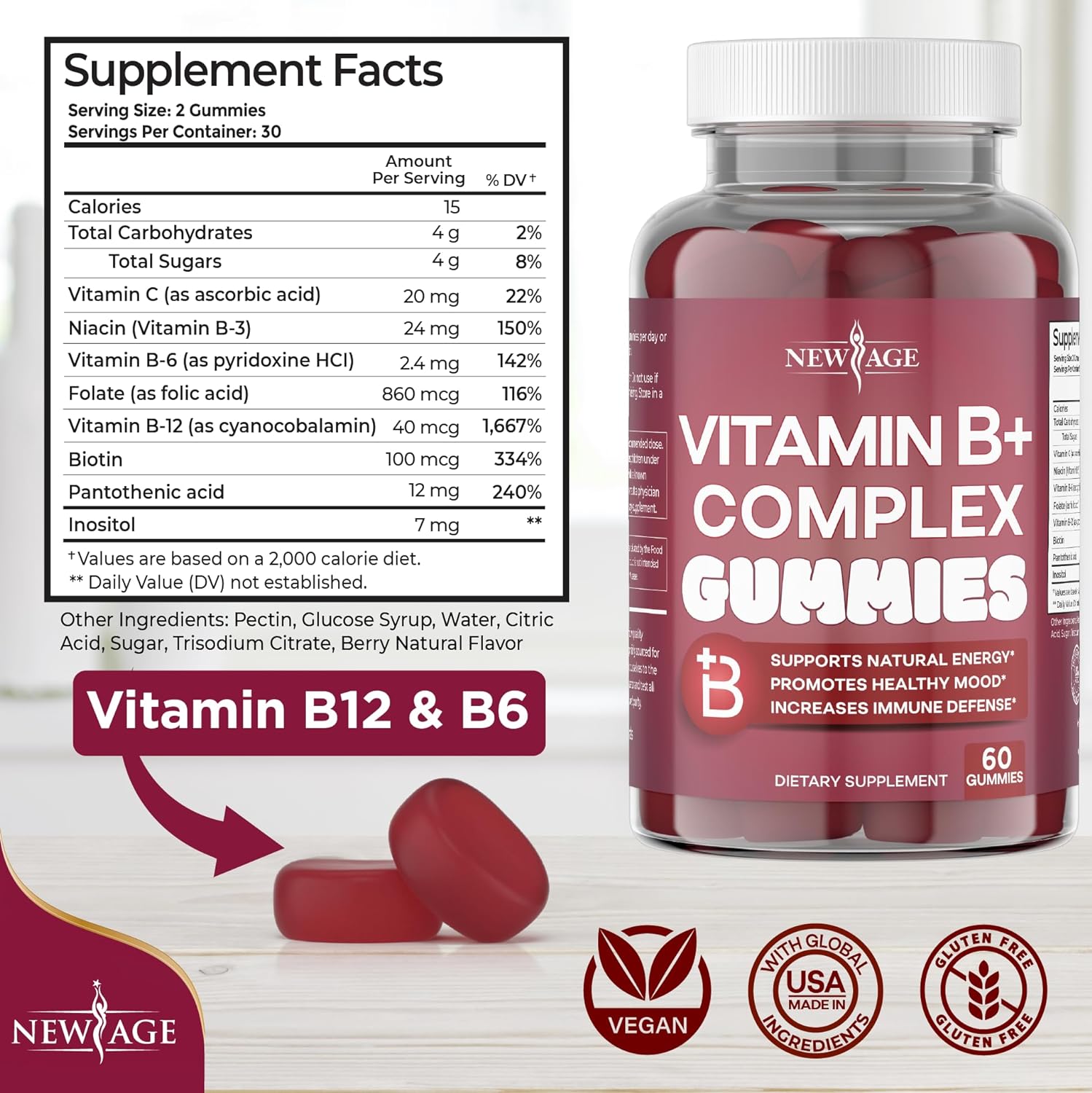 New Age Vitamin B Complex Gummies With Vitamin B3, B5, B6, B7, B9 & B12 With Biotin, Folic Acid & Vitamin C Gluten-Free, Vegan, Made In The Usa! (60 Count (Pack Of 1))