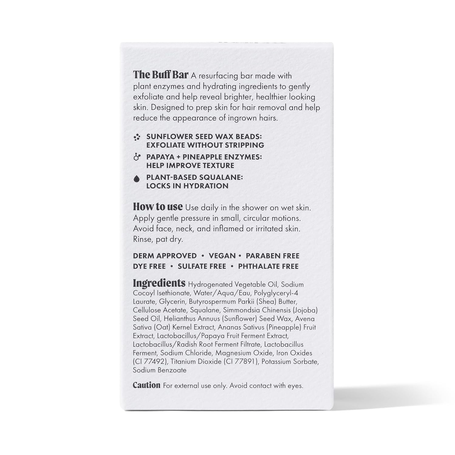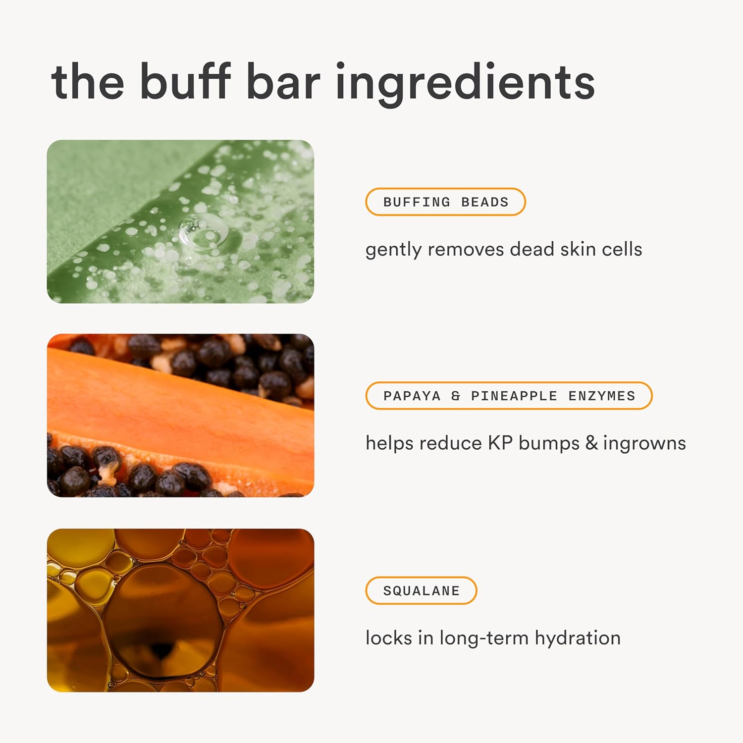 About this item Gentle Pre-Shave Prep — Give your skin a smoother starting point before shaving or waxing. The Nood Buff Bar works as a gentle exfoliator, helping reduce bumps and ingrown hairs—ideal for anyone seeking the best exfoliator for the pubic area or a pre-shave boost on legs and underarms. Plant Enzymes & Antioxidants — Formulated with natural enzymes and potent antioxidants, our Buff Bar replaces harsh sugar scrubs for women with a kinder, non-drying approach. It effectively lifts away dead skin, unveiling brighter, healthier-looking skin each time you use this exfoliating scrub. Targets KP, Ingrowns & Strawberry Skin — Say goodbye to keratosis pilaris and those stubborn red bumps. Acting like a kp scrub, our Buff Bar also tackles strawberry skin and ingrown hairs—making it the perfect kp bump eraser body scrub for both women and men, no matter your skin type. Safe For Daily Use & Sensitive Skin — Gentle enough for everyday use, this soap-free, fragrance-free body exfoliator scrub won’t strip moisture or irritate sensitive areas. It’s an ideal addition to your routine, whether you favor body scrubs for women exfoliation or a more natural body scrub for all-over care. Works Everywhere Hair Grows — Designed to prep and polish skin across the body, including tricky spots like the bikini line, arms, and legs. Achieve better results with IPL, shaving, or waxing—while enjoying a product that’s easier to use, more effective, and kinder on skin than typical sugar scrubs. See more product details,Gentle Pre-Shave Prep — Give your skin a smoother starting point before shaving or waxing. The Nood Buff Bar works as a gentle exfoliator, helping reduce bumps and ingrown hairs—ideal for anyone seeking the best exfoliator for the pubic area or a pre-shave boost on legs and underarms,Plant Enzymes & Antioxidants — Formulated with natural enzymes and potent antioxidants, our Buff Bar replaces harsh sugar scrubs for women with a kinder, non-drying approach. It effectively lifts away dead skin, unveiling brighter, healthier-looking skin each time you use this exfoliating scrub,Targets KP, Ingrowns & Strawberry Skin — Say goodbye to keratosis pilaris and those stubborn red bumps. Acting like a kp scrub, our Buff Bar also tackles strawberry skin and ingrown hairs—making it the perfect kp bump eraser body scrub for both women and men, no matter your skin type,Safe For Daily Use & Sensitive Skin — Gentle enough for everyday use, this soap-free, fragrance-free body exfoliator scrub won’t strip moisture or irritate sensitive areas. It’s an ideal addition to your routine, whether you favor body scrubs for women exfoliation or a more natural body scrub for all-over care,Works Everywhere Hair Grows — Designed to prep and polish skin across the body, including tricky spots like the bikini line, arms, and legs. Achieve better results with IPL, shaving, or waxing—while enjoying a product that’s easier to use, more effective, and kinder on skin than typical sugar scrubs
