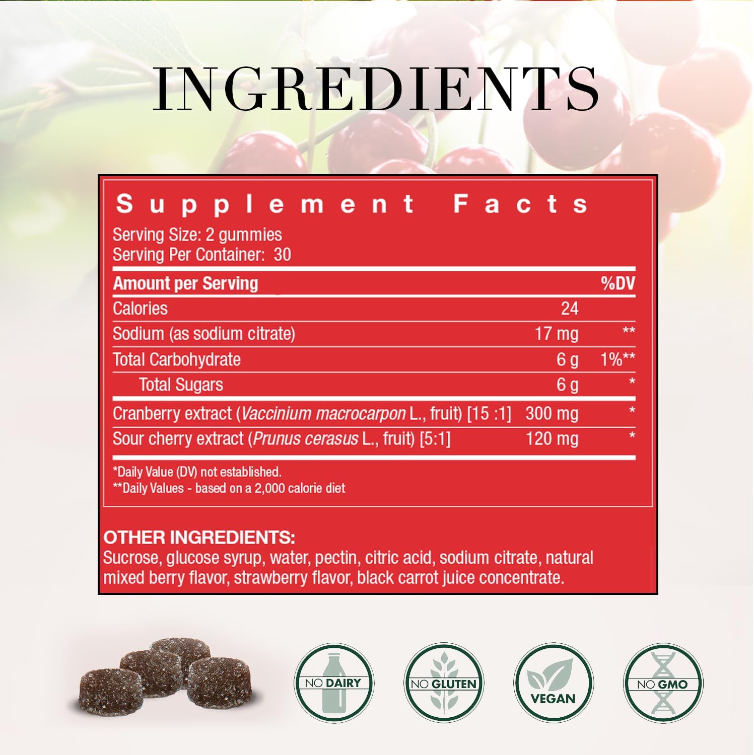 URINARY TRACT SUPPORT - Adults take 2-3 gummies per day to support a normal functioning urinary tract system10BENEFITS - Supports normal urinary tract, bladder, and balanced body for people who want a natural solution10NATURALLY SOURCED - Sour Cherry and Cranberry extracts are pectin based with potent, natural strength10PURE INGREDIENTS - Vegan, non-GMO, gluten free, dairy free formula contains no artificial colors, flavors, or preservatives10SCANDINAVIAN MADE - Taking the best of traditional medicine and biological science, we source high quality, pure ingredients to create supplements that work with your body's natural systems for healthier, more sustainable results1010