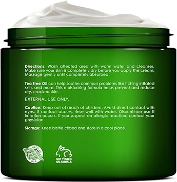 About this item TEA TREE FOOT CREAM & BODY CREAM – Tea Tree Oil is a potent oil with amazing benefits for dry feet. This foot cream can help hydrate and soothe itchy, irritated feet. Great foot moisturizer for dry cracked feet. FOOT REPAIR CREAM – Our sore foot cream for dry cracked heels and dry cracked skin is made of natural ingredients that help soothe and soften dry, irritated heels and feet. Callus foot cream for men and women. ATHLETES FOOT TREATMENT CREAM – Athletes foot can be itchy, irritated, dry, cracked, and painful. This athletes foot cream and nail foot fungus cream is a great natural nail fungus treatment for toenail. SOFTENING FOOT CREAM - Our moisturizing cream for foot care creates a protective layer on the skin’s surface that instantly boosts moisture levels and helps prevent further moisture loss. MADE IN THE USA - Our ringworm and jock itch cream is made using the highest quality Ingredients. It does not contain alcohol, parabens or sulfates and is Cruelty Free. › See more product details,TEA TREE FOOT CREAM & BODY CREAM – Tea Tree Oil is a potent oil with amazing benefits for dry feet. This foot cream can help hydrate and soothe itchy, irritated feet. Great foot moisturizer for dry cracked feet,FOOT REPAIR CREAM – Our sore foot cream for dry cracked heels and dry cracked skin is made of natural ingredients that help soothe and soften dry, irritated heels and feet. Callus foot cream for men and women,ATHLETES FOOT TREATMENT CREAM – Athletes foot can be itchy, irritated, dry, cracked, and painful. This athletes foot cream and nail foot fungus cream is a great natural nail fungus treatment for toenail,SOFTENING FOOT CREAM - Our moisturizing cream for foot care creates a protective layer on the skin’s surface that instantly boosts moisture levels and helps prevent further moisture loss,MADE IN THE USA - Our ringworm and jock itch cream is made using the highest quality Ingredients. It does not contain alcohol, parabens or sulfates and is Cruelty Free