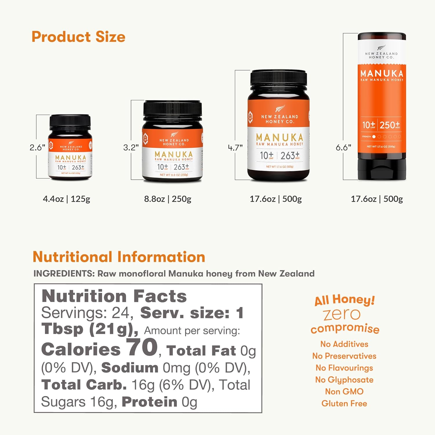 New Zealand Honey Co. Pure Manuka Honey Squeeze Bottle Umf 10+ / Mgo 250+ | 17.6Oz | 1.1 Lb. (500G)
