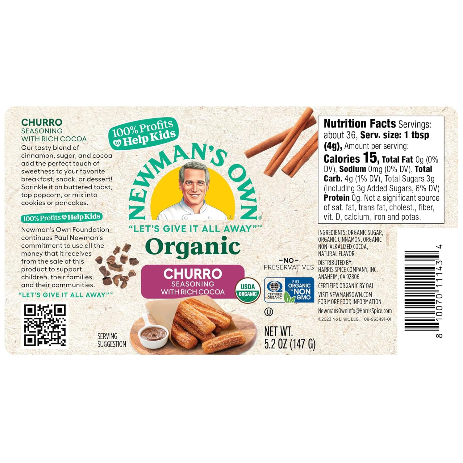 Newman's Own Organic Churro Seasoning with Rich Cocoa: Our tasty blend of cinnamon, sugar, and cocoa add the perfect touch of sweetness on your favorite breakfast, snack and desserts! Add the mouth-watering taste of delicious warm churros to your favorite dishes