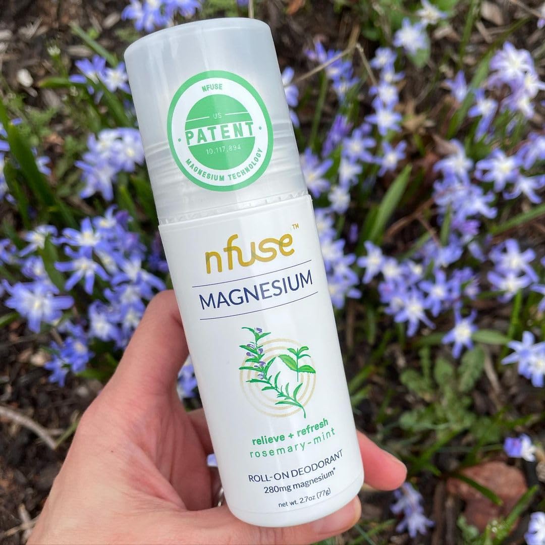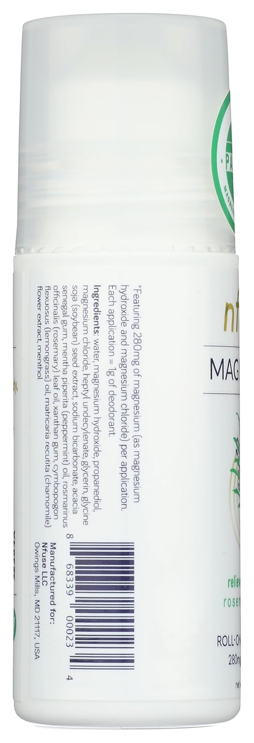 About this item MORE THAN A DEODORANT: We are a self-care regimen that takes seconds to incorporate into your daily routine. PATENTED TECHNOLOGY WITH REAL RESULTS: We are the only magnesium deodorant with innovative permeation technology that optimizes magnesium delivery to the skin, while also knocking out odors and keeping them out. NATURALLY CLEAN: Effectively neutralizes odor before it starts and delivers long lasting odor protection. Good for Sensitive Skin. RELIEVE + REFRESH | ROSEMARY MINT: Feel revitalized with specially formulated properties of herbaceous rosemary and peppermint. PREMIUM NATURAL INGREDIENTS: Naturally Derived. Free of aluminum, parabens, GMOs, phthalates, zinc salts and artificial fragrance. Vegan, cruelty-free and proudly made in the USA. Women Owned. nfuse skincare products make the perfect Stocker Stuffer, Christmas gift, Mother's Day gift, or "just because" gift for mom. MAGNESIUM RICH: Sustainable sourced. High Purity. 280 mg of magnesium (as magnesium hydroxide and magnesium chloride) per application (1ml). › See more product details,MORE THAN A DEODORANT: We are a self-care regimen that takes seconds to incorporate into your daily routine,PATENTED TECHNOLOGY WITH REAL RESULTS: We are the only magnesium deodorant with innovative permeation technology that optimizes magnesium delivery to the skin, while also knocking out odors and keeping them out,NATURALLY CLEAN: Effectively neutralizes odor before it starts and delivers long lasting odor protection. Good for Sensitive Skin,RELIEVE + REFRESH | ROSEMARY MINT: Feel revitalized with specially formulated properties of herbaceous rosemary and peppermint,PREMIUM NATURAL INGREDIENTS: Naturally Derived. Free of aluminum, parabens, GMOs, phthalates, zinc salts and artificial fragrance. Vegan, cruelty-free and proudly made in the USA. Women Owned. nfuse skincare products make the perfect Stocker Stuffer, Christmas gift, Mother's Day gift, or "just because" gift for mom,MAGNESIUM RICH: Sustainable sourced. High Purity. 280 mg of magnesium (as magnesium hydroxide and magnesium chloride) per application (1ml)