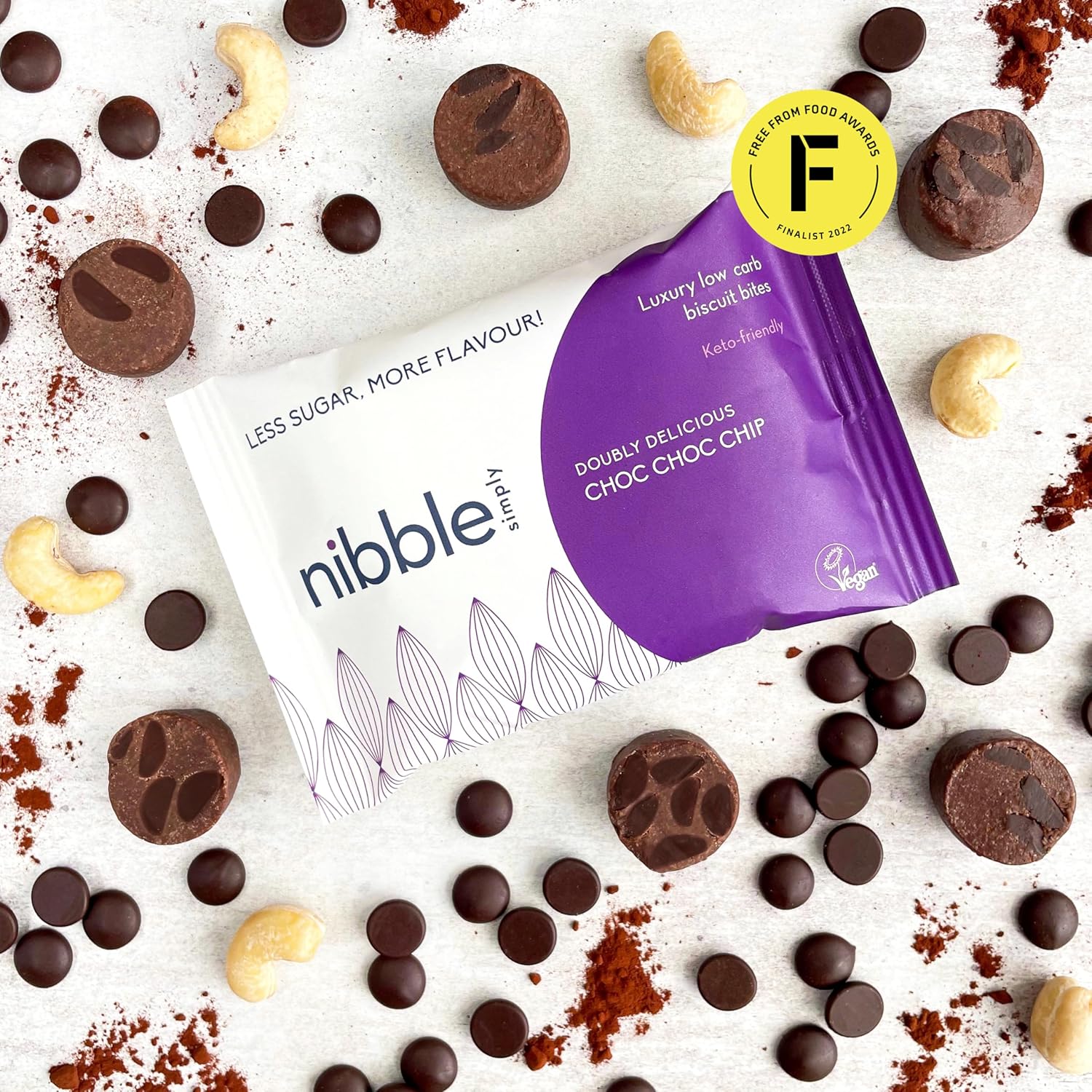 Nibble Simply Doubly Delicious Choc Choc Chip - Low Carb, Lower Sugar, Keto-Friendly, Vegan (12 X 36G Packs)