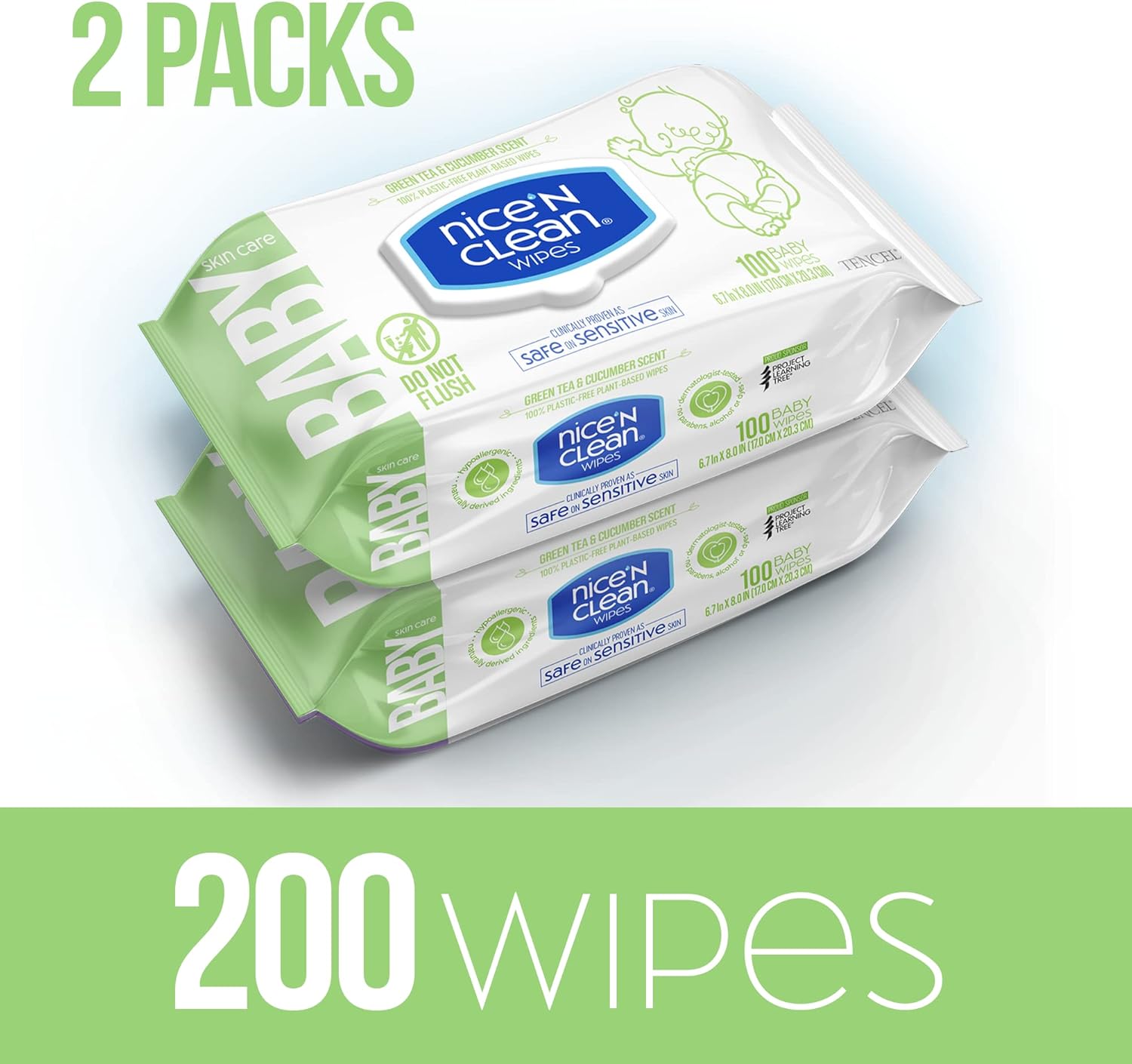 Nice 'N Clean Skin Care Baby Wipes Scented 100Ct (2-Pack) | Safe On Sensitive Skin | Green Tea & Cucumber Scent | 100% Plastic-Free