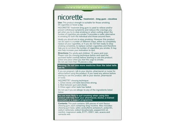 Nicorette Freshmint Nicotine Gum is designed to help reduce nicotine cravings and withdrawal symptoms while quitting smoking. Each piece delivers 2mg of nicotine in a refreshing mint flavor, making it a discreet and effective stop smoking aid. Convenient 105-count supply supports your quit journey with on-the-go relief.