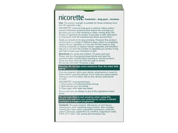 Product Information:Nicorette Gum Helps Relieve Cravings For Cigarettes Whether You Are Cutting Down Or Stopping Smoking Completely,Features:Nicorette® Gum Acts Fast To Help You Deal With Cravings,Product Specification:This Pack Contains 105 Pieces Of Mint Flavour Chewing Gum, Each Containing 4Mg Nicotine, Also Includes: Polacrilin, Chewing Gum Base Containing Butylated Hydroxy Toluene (E321) Xylitol, Peppermint Oil, Sodium Carbonate, Anhydrous, Acesulfame Potassium, Levomenthol, Magnesium Oxide, Light, Quinoline Yellow Al Lake (E104), Talcum, Nitrogen, Food Grade. Coating: Xylitol, Peppermint Oil, Acacia, Titanium Dioxide (E171),Carnauba Wax, Quinoline Yellow Al Lake (E104)