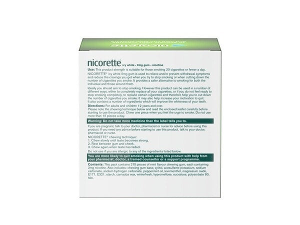 Product Information:Nicorette® Icy White Gum Relieves And/Or Prevents Withdrawal Symptoms Including Cravings Experienced When Trying To Stop Smoking Or Cutting Down On Cigarettes.Helps Actively Fight Cravings &Amp; Whitens Teeth, Reducing One Of The Longer Term Impacts Of Smoking On Your Appearance,Features:This Pack Contains 210 Pieces Of Mint Flavour Chewing Gum, Each Containing 2Mg Nicotine,Benefit:Nicorette® Icy White Gum Relieves And/Or Prevents Withdrawal Symptoms Including Cravings Experienced When Trying To Stop Smoking Or Cutting Down On Cigarettes.Helps Actively Fight Cravings &Amp; Whitens Teeth, Reducing One Of The Longer Term Impacts Of Smoking On Your Appearance,Warning Or Restrictions:Keep Out Of Reach Of Children. For External Use Only,Product Specification:Also Includes: Chewing Gum Base, Xylitol, Acesulfame Potassium, Sodium Carbonate, Sodium Hydrogen Carbonate, Peppermint Oil, Levomenthol, Magnesium Oxide, E171, E321, Starch, Carnauba Wax, Winterfresh, Hypromellose, Sucralose, Polysorbate 80, Talc,Recyclable:N/A