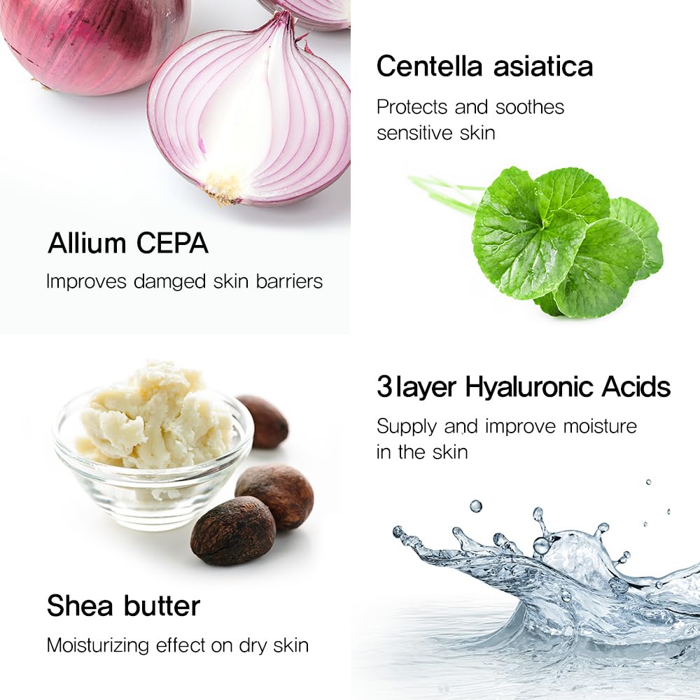 About this item [ONION CREAM] : Optimal combination of Allium Cepa, main ingredient of scar treatment remedy and Centella asiatica extract, main ingredient of damage treatment agent helps replenish necessary nourishment and improves dermal barrier for healthier skin. CEPACICA cream is the maximum moisturizing texture that absorbs into the skin without dryness. [REDNESS REDUCED] : CICA (Centella asiatica extract) and Allantoin help soothe and protect irritated skin, also relieve redness on skin. A clinically evaluated skin barrier-reinforcing formula that relieves redness and helps hydrate the skin. [MOISTUREIZING] : Contains triple Hyaluronic Acid and Vitamin B5 (Panthenol) to prevent moisture in the skin from evaporating. This anti-aging cream also contains Meadowfoam Seed Oil, which provides smooth and radiant skin. [CLINICAL TEST COMPLETED & VEGAN CERTIFIED] : Improvement of skin barrier and soothing effect of skin(Redness) by external stimulus, and Improvement of dermal(2.5mm) hydration AND Vegan certified cosmetic that excludes animal ingredients and animal testing. › See more product details,[ONION CREAM] : Optimal combination of Allium Cepa, main ingredient of scar treatment remedy and Centella asiatica extract, main ingredient of damage treatment agent helps replenish necessary nourishment and improves dermal barrier for healthier skin. CEPACICA cream is the maximum moisturizing texture that absorbs into the skin without dryness,[REDNESS REDUCED] : CICA (Centella asiatica extract) and Allantoin help soothe and protect irritated skin, also relieve redness on skin. A clinically evaluated skin barrier-reinforcing formula that relieves redness and helps hydrate the skin,[MOISTUREIZING] : Contains triple Hyaluronic Acid and Vitamin B5 (Panthenol) to prevent moisture in the skin from evaporating. This anti-aging cream also contains Meadowfoam Seed Oil, which provides smooth and radiant skin,[CLINICAL TEST COMPLETED & VEGAN CERTIFIED] : Improvement of skin barrier and soothing effect of skin(Redness) by external stimulus, and Improvement of dermal(2.5mm) hydration AND Vegan certified cosmetic that excludes animal ingredients and animal testing
