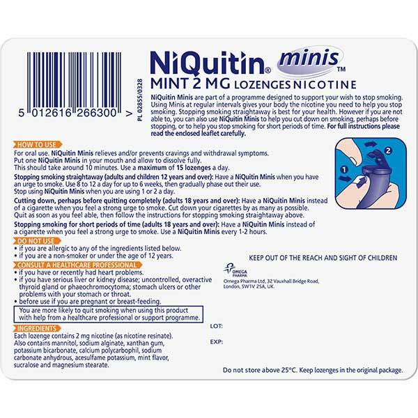 Product Information:Niquitin Minis Are Part Of A Programme Designed To Support Your Wish To Stop Smoking. Using Minis At Regular Intervals Gives Your Body The Nicotine You Need To Help You Stop Smoking,Features:Handy Pocket-Sized Container You Can Always Keep With You Dissolves In The Mouth In Approximately 10 Minutes Use To Stop Smoking Or To Cut Down How Many Cigarettes You Smoke Effective On The Go Craving Relief,Warning Or Restrictions:Consult Your Doctor Or Pharmacist If You Have An Underlying Medical Condition, Are Taking Any Other Medication Or Complementary Therapy, Or If Symptoms Persist Seek Advice Before Using If You Are Pregnant, Planning To Become Pregnant, Breastfeeding Or Suffer From Allergies. Don Not Use If You Are Allergic To Any Of The Ingredients Listed Below And If You Are A Non-Smoker Or Under The Age Of 12 Years,Product Specification:Each Lozenge Contains 2 Mg Nicotine (As Nicotine Resinate). Also Contains Mannitol, Sodium Alginate, Xanthan Gum, Potassium Bicarbonate, Calcium Polycarbophil, Sodium Carbonate Anhydrous, Acesulfame Potassium, Mint Flavor, Sucralose And Magnesium Stearate,Product Uses:For Oral Use. Niquitin Minis Relieves And/Or Prevents Cravings And Withdrawal Symptoms. Put One Niquitin Minis In Your Mouth And Allow To Dissolve Fully. This Should Take Around 10 Minutes. Use A Maximum Of 15 Lozenges A Day