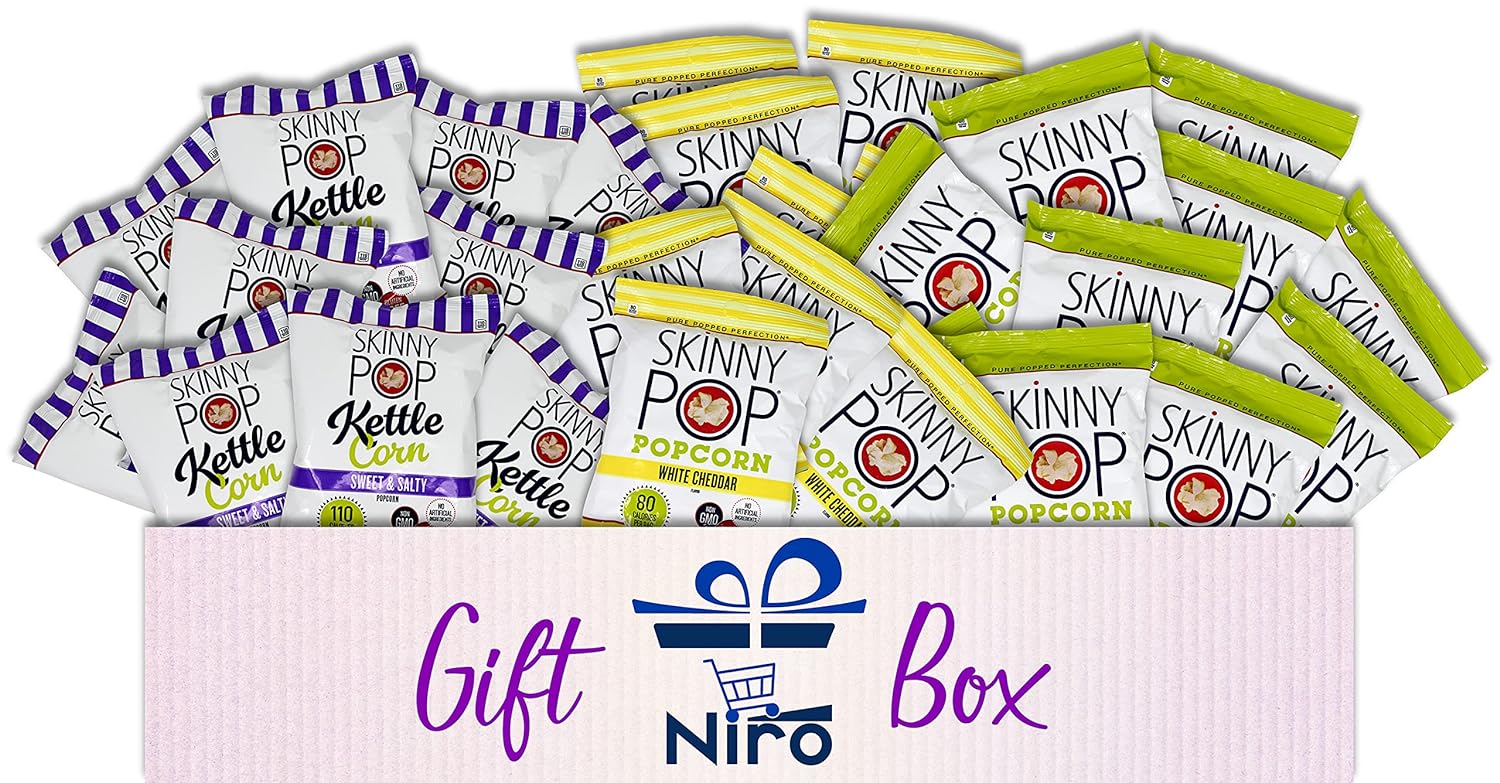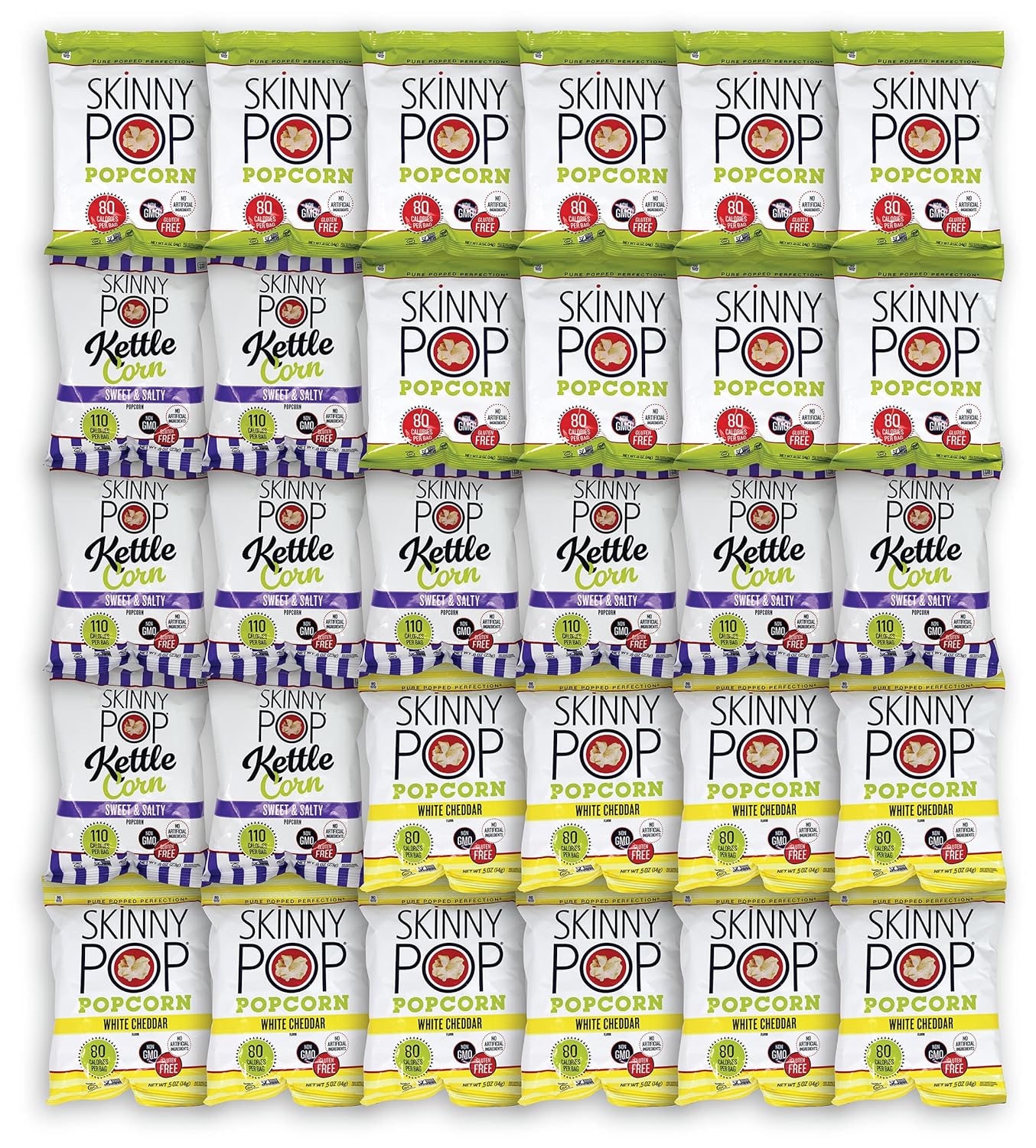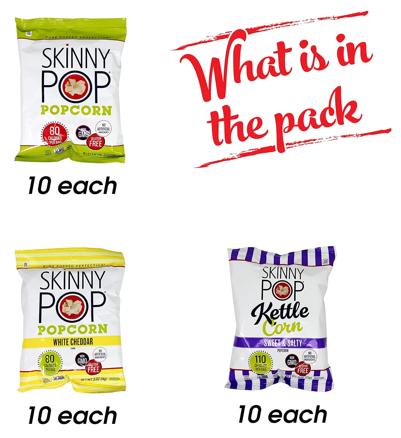 ??This kit contains popcorn snacks individual packs of Skinny Pop in 3 flavors. Enjoy 80-110 calories per servings with 10-Regular, 10-White Cheddar, and 10-Sweet&Salty individual popcorn bags10??Enjoy convenient snacking wherever you go with the skinny popcorn packs. Each individual skinny popcorn of three flavors provides a good amount of crunchy goodness to satisfy any craving10??On-the-go - Take your favorite snacks on-the-go with 30 packs of 3 flavors of snacks. Enjoy the crisp, white cheddar flavor while still being free of peanuts, tree nuts, soy, wheat and eggs10??Delicious Flavors - Treat yourself to delicious flavors of cheddar and two other varieties of popcorn with this snack pack. Enjoy an indulgent and flavorful experience with 30 packs of 3 flavors10??Allergen-Friendly - This popcorn variety pack provides a safe and allergen-friendly snack with three delicious flavors. Plus, it comes in convenient packs of 30, making it easy to enjoy10