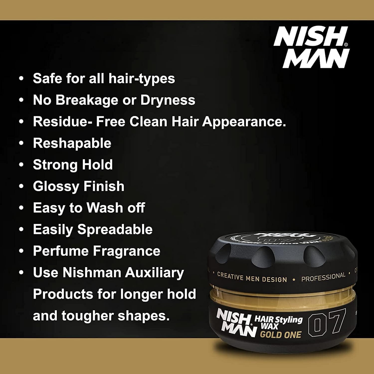 About this item Nishman Hair Styling Wax Gold One 07 150 ml Ensures perfect strong shiny-look hold Non-greasy and easy to brush out by combing Ideal for use on dry and damp hair Washes out very well with normal shampoo Fragrance: fresh men's fragrance, volume: 150 ml › See more product details,Nishman Hair Styling Wax Gold One 07 150 ml,Ensures perfect strong shiny-look hold,Non-greasy and easy to brush out by combing,Ideal for use on dry and damp hair,Washes out very well with normal shampoo,Fragrance: fresh men's fragrance, volume: 150 ml