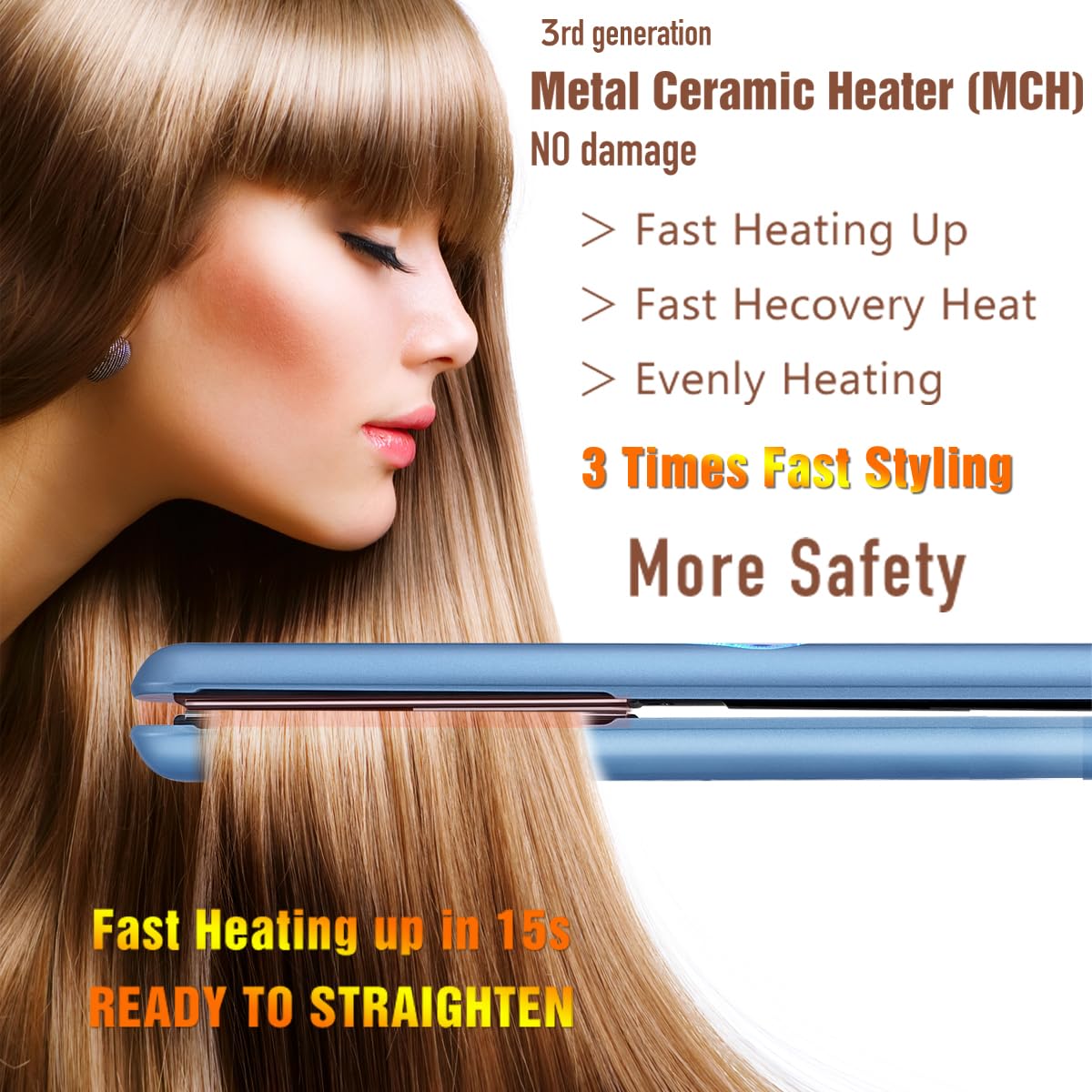Nition Nano Titanium Hair Straightener 1" Heating Plate Smooth Straightening Flat Iron For Hair. Lcd 265-450°F Adjustable For All Hair Type. Travel Pouch Bag Included. Mch Fast Heating Up. Blue
