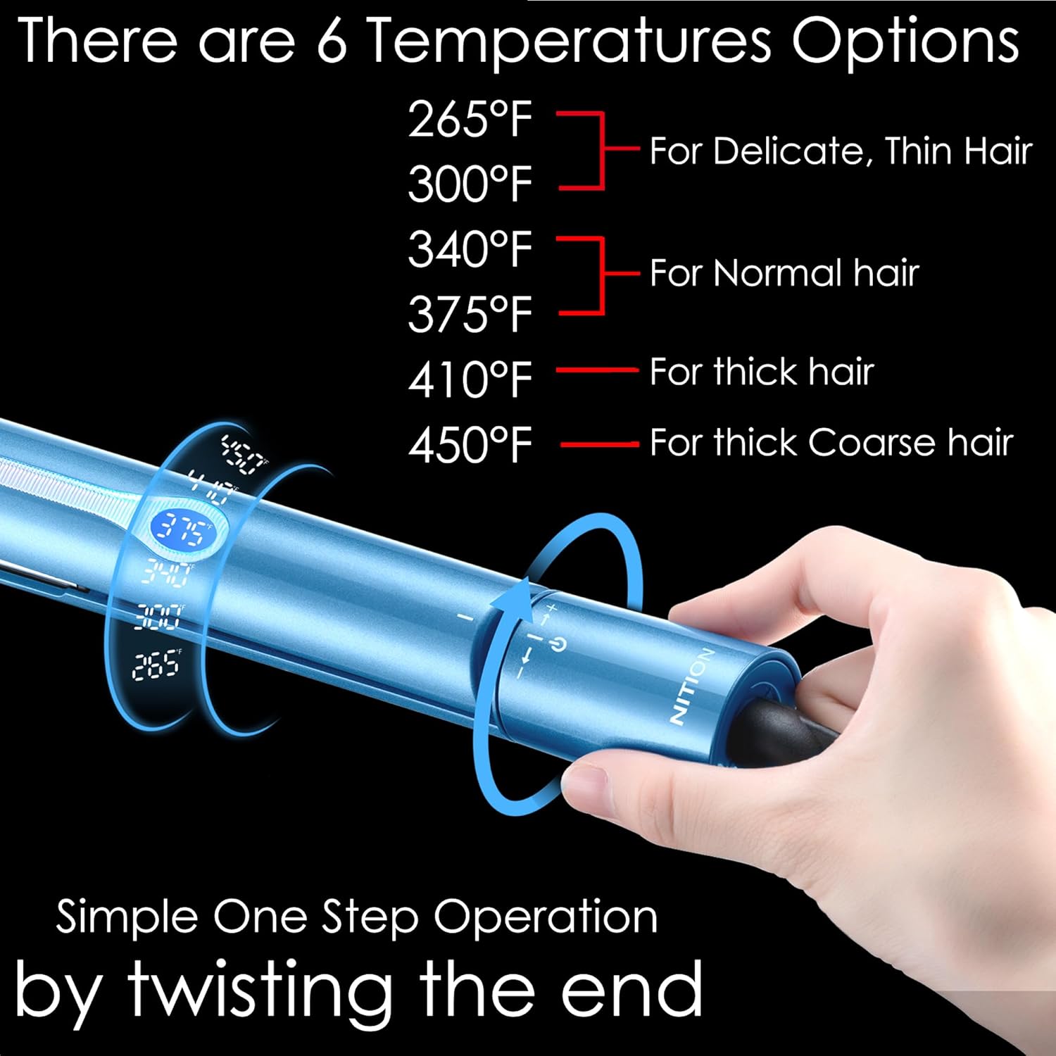 About this item Ultra Smooth Nano Titanium Heating Plate for smoothly straightening hair. The mirrolike smooth surface helps to protect hair from damage.The 3D flexible floating heating plate helps adjust the angle to avoid snagging or pinching hair,glide smoothly through hair. Support LCD 6 Specific Temperature Levels Selectable: 265°F/300°F/340°F/375°F/410°F/450°F. (NO OTHER TEMPERATURES). Recommend Setting: 265°F or 300°F for Delicate, Thin Hair; 345°F or 370°F for Normal Hair; 410°F for Thick, 450°F for Thick Coarse Hair. Please choose the appropriate temperature based on your hair type. TIPS: If above particular temperature settings doesn't deliver the desired results, please first try using a nearby temperature level. Without any buttons on the whole body make it looks more sleek and concise style. Simple One Step Operation by twisting the end of straightener: Clockwise to power on and set temperature. Anticlockwise to decrease and power off. There is no chance of accidentally pressing buttons like traditional straighteners with buttons. With MCH Fast Heating Up & unique C-Sensor Feature(Auto Temperature Calibrating), it gives evenly, fast recovery heat and helps to achieve the best style effect with long lasting. NITION flat iron has 4.1" long heating plate which provide more heating contacted area than normal short one, means styling a bunch of more hair at a time, more efficient. The 3D flexible floating heating plate helps adjust the angle to avoid snagging or pinching hair, glide smoothly through hair. If you are really good at curling hair with a flat iron, then it can be your 2-IN-1 Hair Styling Tool for both straightening or curling. More TIPS for how to curl well, please read the manual careful for helpful TIPS and learn more curling skills from online video tutorial. Comes with a useful heat proof silicon sleeve for using to keep 2 plates closed for storing purpose after styling without waiting cooling. It also help to aovid scratching damage or dust, dirty on the plates during the travel. › See more product details,Ultra Smooth Nano Titanium Heating Plate for smoothly straightening hair. The mirrolike smooth surface helps to protect hair from damage.The 3D flexible floating heating plate helps adjust the angle to avoid snagging or pinching hair,glide smoothly through hair,Support LCD 6 Specific Temperature Levels Selectable: 265°F/300°F/340°F/375°F/410°F/450°F. (NO OTHER TEMPERATURES). Recommend Setting: 265°F or 300°F for Delicate, Thin Hair; 345°F or 370°F for Normal Hair; 410°F for Thick, 450°F for Thick Coarse Hair. Please choose the appropriate temperature based on your hair type. TIPS: If above particular temperature settings doesn't deliver the desired results, please first try using a nearby temperature level,Without any buttons on the whole body make it looks more sleek and concise style. Simple One Step Operation by twisting the end of straightener: Clockwise to power on and set temperature. Anticlockwise to decrease and power off. There is no chance of accidentally pressing buttons like traditional straighteners with buttons,With MCH Fast Heating Up & unique C-Sensor Feature(Auto Temperature Calibrating), it gives evenly, fast recovery heat and helps to achieve the best style effect with long lasting. NITION flat iron has 4.1" long heating plate which provide more heating contacted area than normal short one, means styling a bunch of more hair at a time, more efficient,The 3D flexible floating heating plate helps adjust the angle to avoid snagging or pinching hair, glide smoothly through hair. If you are really good at curling hair with a flat iron, then it can be your 2-IN-1 Hair Styling Tool for both straightening or curling. More TIPS for how to curl well, please read the manual careful for helpful TIPS and learn more curling skills from online video tutorial,Comes with a useful heat proof silicon sleeve for using to keep 2 plates closed for storing purpose after styling without waiting cooling. It also help to aovid scratching damage or dust, dirty on the plates during the travel