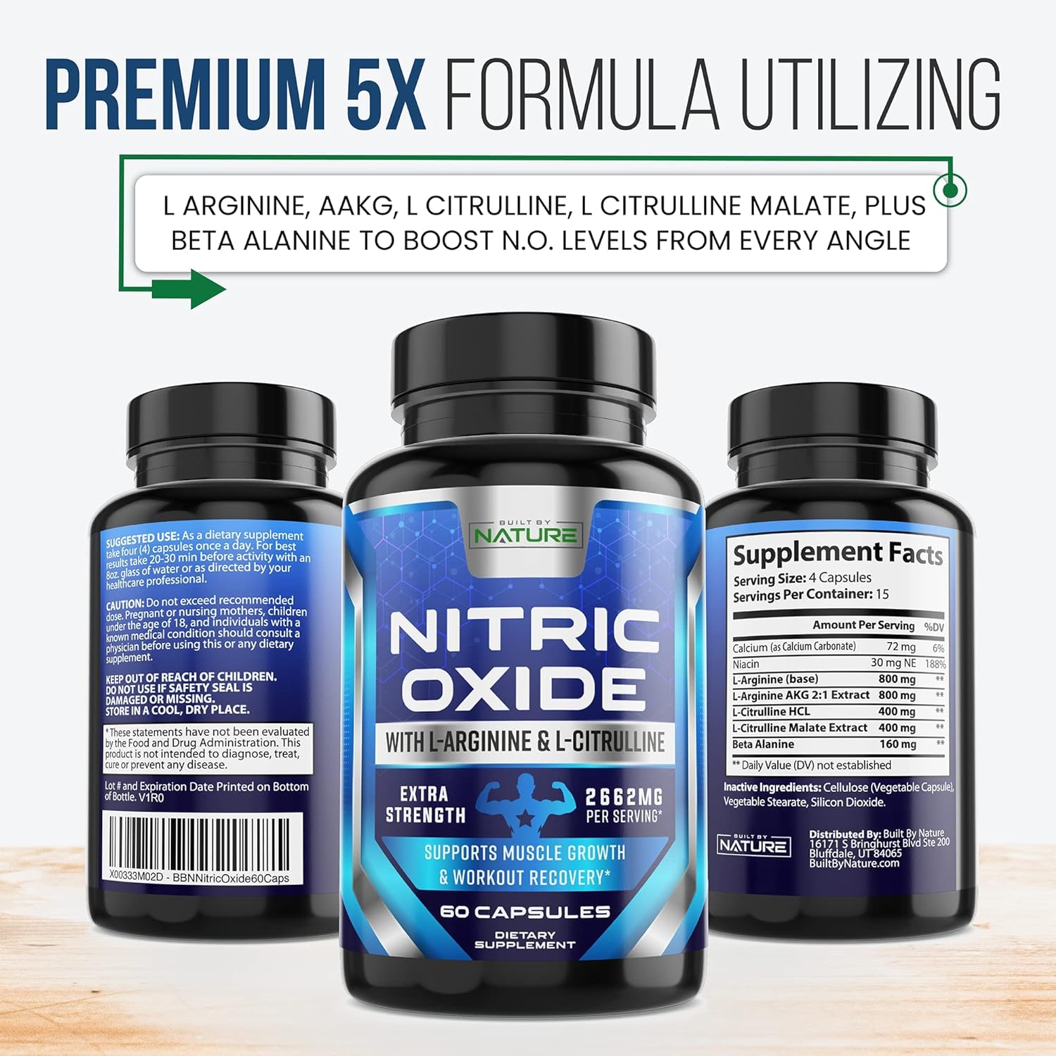 Nitric Oxide Supplement L Arginine Extra Strength - Citrulline Malate, AAKG, Beta Alanine - Premium Muscle Supporting Nitric Booster for Strength & Energy to Train Harder - 60 Capsules